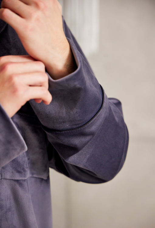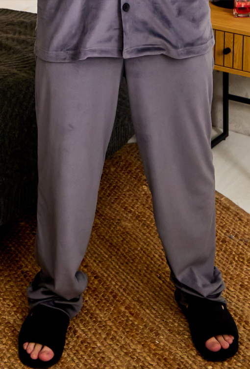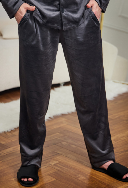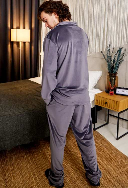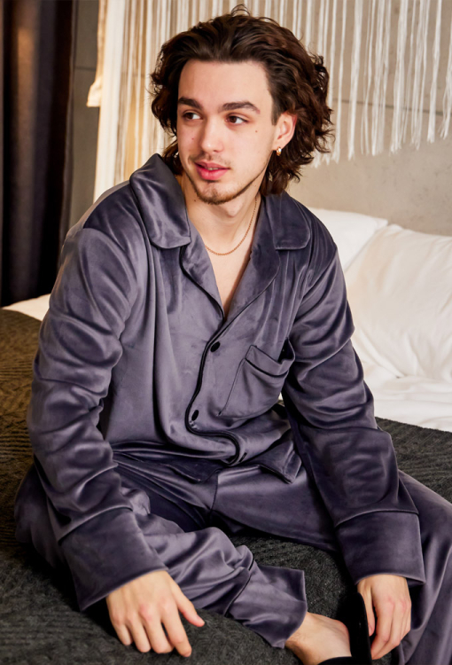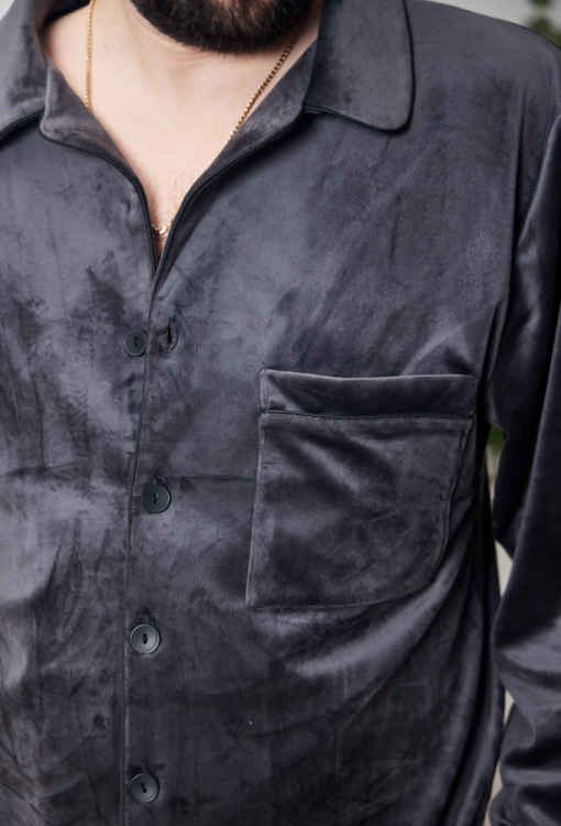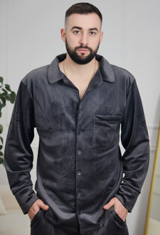 Стильная пижама мужская от украинского бренда Tomiko. Пижама выполнена из мягкого и качественного велюра графитового цвета, состоит из рубашки со штанами прямого силуэта. Рубашка с длинными рукавами на свободных манжетах и отложным воротником, застегивается на пуговицы. На груди слева изделие украшено накладным карманом, воротник, полки, рукава и карман обработаны тонким кантом черного цвета. Штаны с мягкой резинкой в поясе и удобными боковыми карманами, внизу украшены тонким контрастным кантом и обработаны свободными манжетами. Пижама очень красивая и комфортная, идеальна для сна и домашнего отдыха, а также может быть отличным подарком любимому или близкому человеку.