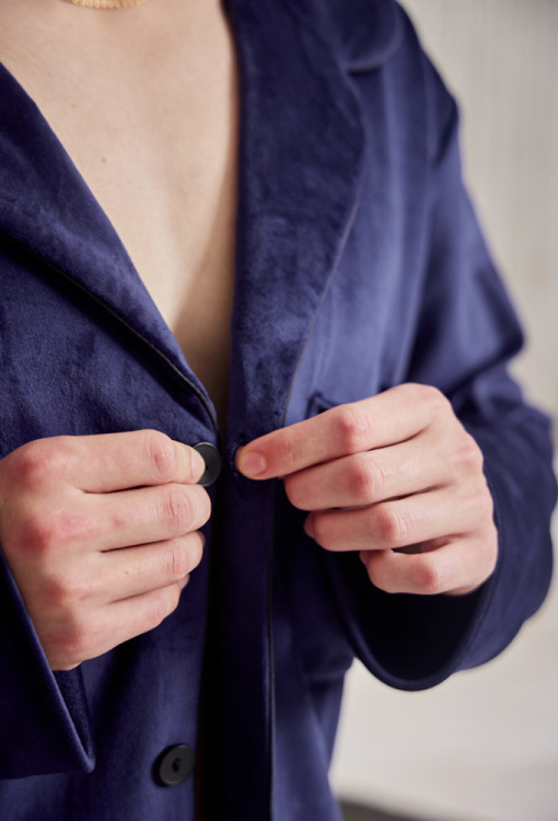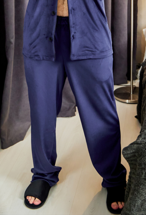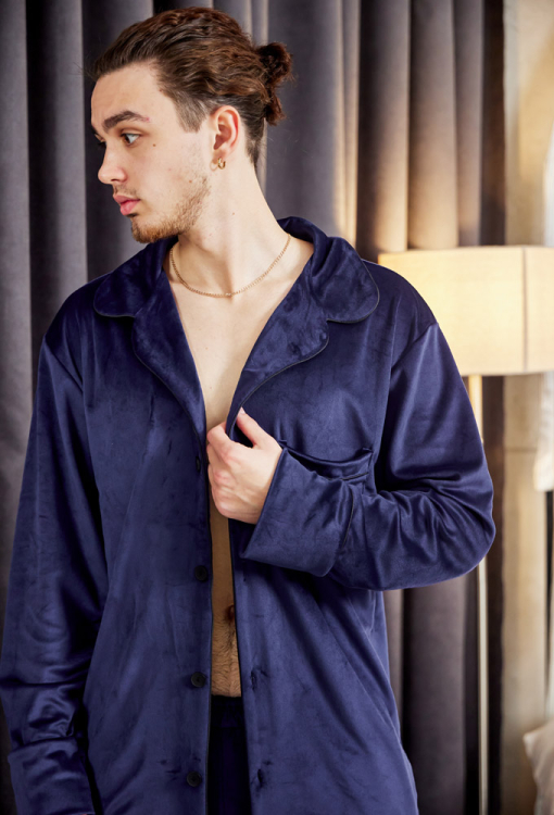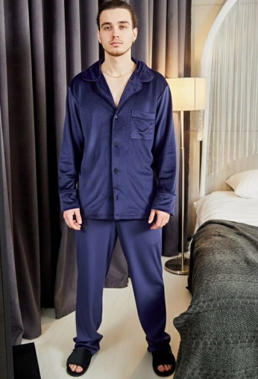 Удобная пижама мужская от украинского бренда Tomiko. Пижама выполнена из мягкого и качественного велюра темно-синего цвета, состоит из рубашки со штанами прямого силуэта. Рубашка с длинными рукавами на свободных манжетах и отложным воротником, застегивается на пуговицы. На груди слева изделие украшено накладным карманом, воротник, полки, рукава и карман обработаны тонким кантом черного цвета. Штаны с мягкой резинкой в поясе и удобными боковыми карманами, внизу украшены тонким контрастным кантом и обработаны свободными манжетами. Пижама очень красивая и комфортная, идеальна для сна и домашнего отдыха, а также может быть отличным подарком любимому или близкому человеку.