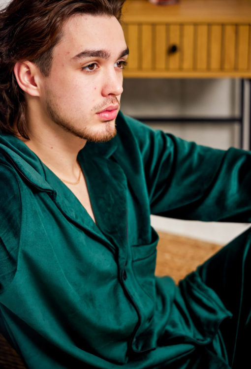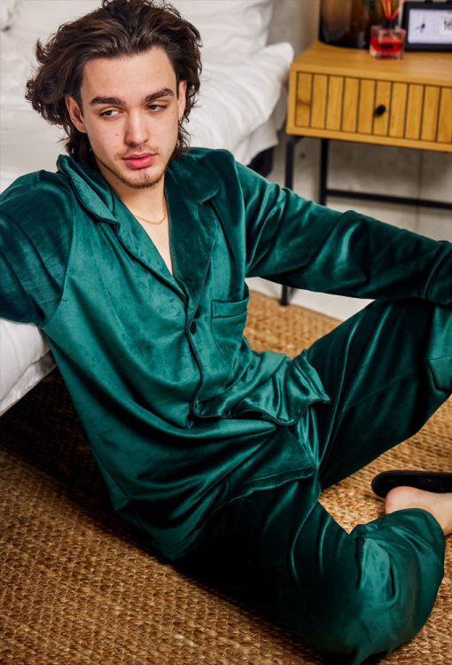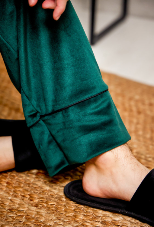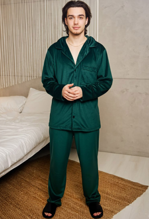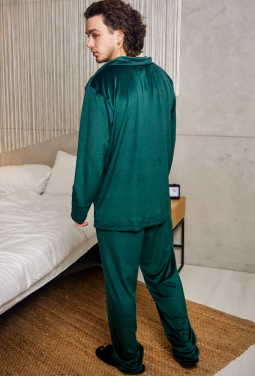Теплая пижама мужская от украинского бренда Tomiko. Пижама выполнена из мягкого и качественного велюра изумрудного цвета, состоит из рубашки со штанами прямого силуэта. Рубашка с длинными рукавами на свободных манжетах и отложным воротником, застегивается на пуговицы. На груди слева изделие украшено накладным карманом, воротник, полки, рукава и карман обработаны тонким кантом черного цвета. Штаны с мягкой резинкой в поясе и удобными боковыми карманами, внизу украшены тонким контрастным кантом и обработаны свободными манжетами. Пижама очень красивая и комфортная, идеальна для сна и домашнего отдыха, а также может быть отличным подарком любимому или близкому человеку.