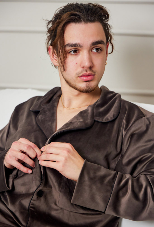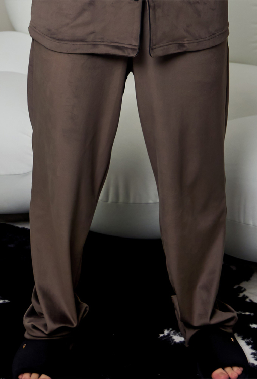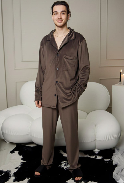 Теплая пижама мужская от украинского бренда Tomiko. Пижама выполнена из мягкого и качественного велюра шоколадного цвета, состоит из рубашки со штанами прямого силуэта. Рубашка с длинными рукавами на свободных манжетах и отложным воротником, застегивается на пуговицы. На груди слева изделие украшено накладным карманом, воротник, полки, рукава и карман обработаны тонким кантом черного цвета. Штаны с мягкой резинкой в поясе и удобными боковыми карманами, внизу украшены тонким контрастным кантом и обработаны свободными манжетами. Пижама очень красивая и комфортная, идеальна для сна и домашнего отдыха, а также может быть отличным подарком любимому или близкому человеку.