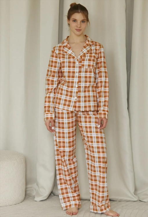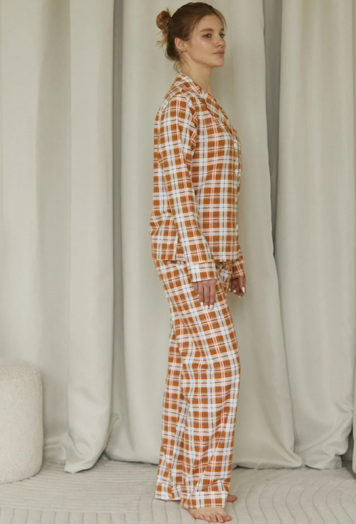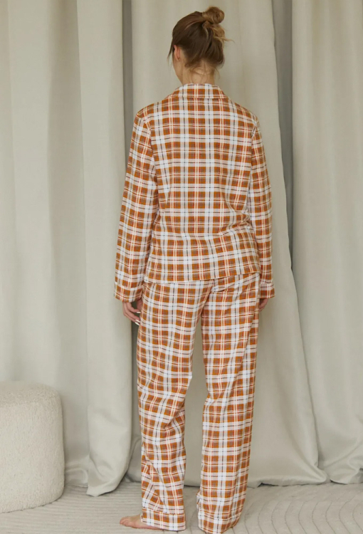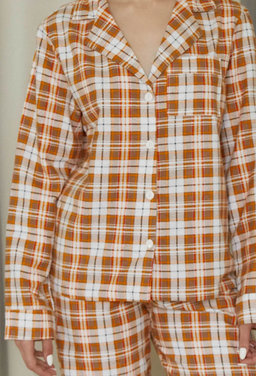 Классическая теплая женская пижама Pumpkin от украинского бренда Forly. Пижама выполнена из качественной и мягкой фланели в оранжевый с серым клетчатый принт, состоит из рубашки свободного силуэта и прямых брюк. Рубашка с длинными рукавами на манжетах и отложным воротником, застегивается на пуговицы, на груди маленький накладной карманчик. Брюки прямые с высокой посадкой, мягкой резинкой в поясе и манжетами. Пижама очень красивая, теплая и комфортная, можно использовать как одежду для дома, а также в качестве подарка любимому и близкому человеку.