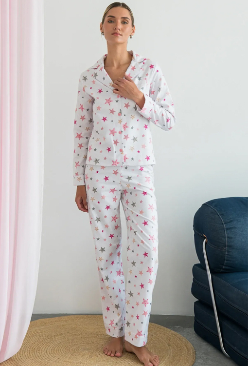 Женская фланелевая пижама Rose Galaxy в классическом стиле от украинского бренда Forly. Пижама выполнена из качественной и мягкой фланели белого цвета в принт из розовых звезд, состоит из рубашки свободного силуэта и прямых брюк. Рубашка с длинными рукавами на манжетах и отложным воротником, застегивается на пуговицы, на груди маленький накладной карманчик. Брюки с удобной высокой посадкой и мягкой резинкой в поясе, внизу обработаны свободными манжетами. Пижама очень красивая, теплая и комфортная, можно использовать как одежду для дома, а также в качестве подарка любимому и близкому человеку.
