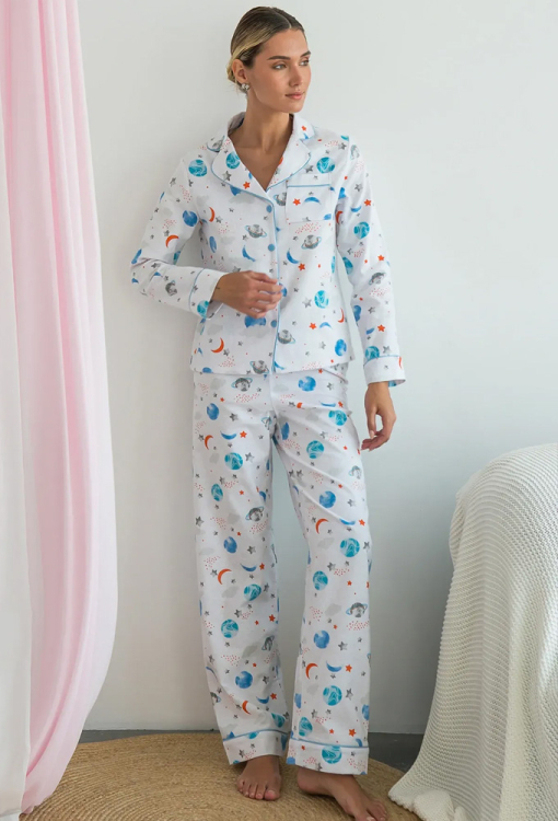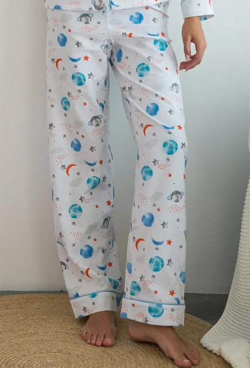 Классическая фланелевая пижама Space от украинского бренда Forly. Пижама выполнена из качественной и мягкой фланели белого цвета в принт из голубых планет и звезд, состоит из рубашки свободного силуэта и прямых брюк. Рубашка с длинными рукавами на манжетах и отложным воротником, застегивается на пуговицы, на груди маленький накладной карманчик. Брюки с удобной высокой посадкой и мягкой резинкой в поясе, внизу обработаны свободными манжетами. Воротник, полки, рукава и карман рубашки, а также манжеты штанов украшены тонким кантом голубого цвета. Пижама очень красивая, теплая и комфортная, можно использовать как одежду для дома, а также в качестве подарка любимому и близкому человеку.