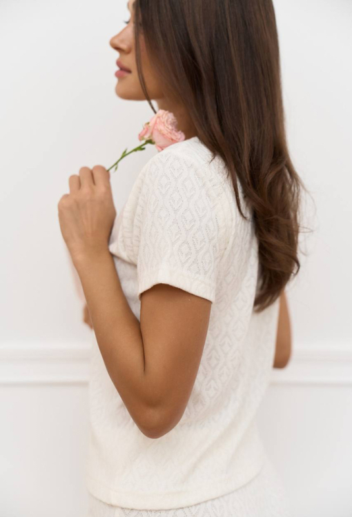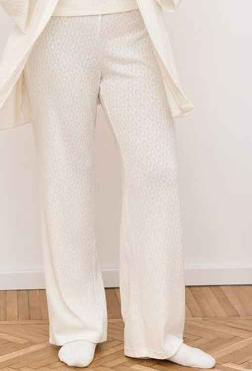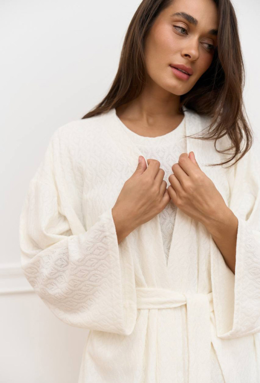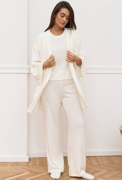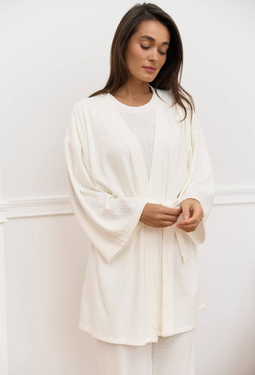 Комфортная женская пижама с халатом от украинского бренда DaLi. Комплект выполнен из качественного и мягкого фактурного трикотажа "Ажур" молочного цвета, состоит из футболки, штанов и халата. Футболка прямого силуэта, с короткими рукавами и круглым вырезом горла, штаны также прямого кроя с удобной посадкой и мягкой резинкой в поясе. Халат длиной мини, свободного силуэта и с длинными рукавами, завязывается на запах с помощью пояса. Комплект очень красивый и удобный, идеален для домашнего отдыха, а также подарка любимому и близкому человеку.