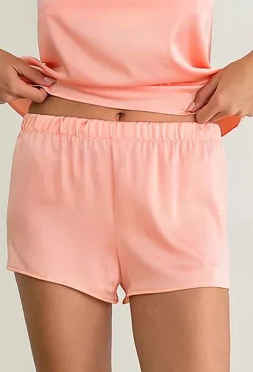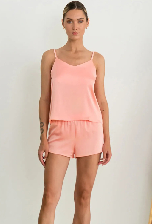 Женская шелковая пижама Kimberly от украинского бренда Forly. Пижама выполнена из качественного и мягкого искусственного шелка розового цвета, состоит из майки свободного силуэта и коротких шорт. Майка на тонких регулируемых бретелях и с V-образным вырезом горла, шорты с мягкой резинкой в поясе. Пижама нежная, комфортная и приятная к телу, благодаря качеству материала, не садится и проста в уходе, идеальна для сна и подарка любимому и близкому человеку.
