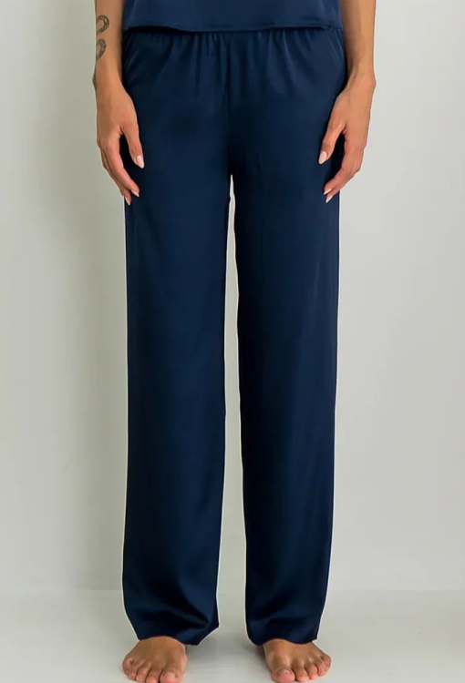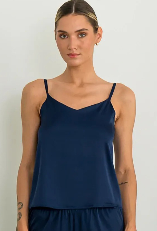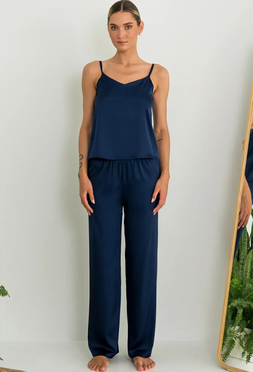 Шелковая пижама Lake от украинского бренда Forly. Пижама выполнена из качественного и мягкого искусственного шелка темно-синего цвета, состоит из майки свободного силуэта и прямых, широких брюк. Майка на тонких регулируемых бретелях и с V-образным вырезом горла, брюки с мягкой резинкой в поясе. Пижама воздушная, комфортная и приятная к телу, можно использовать как одежду для дома, а также в качестве подарка любимому и близкому человеку.