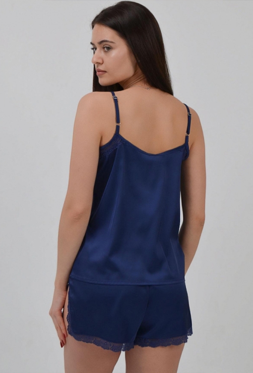 Привлекательная женская пижама из коллекции Ornelia от украинского бренда Leinle. Пижама выполнена из мягкого и качественного искусственного шелка, синего цвета, состоит из майки и коротких шорт. Майка свободного силуэта, на тонких регулируемых бретелях и с V-образным декольте, вырез украшен вставками из тонкого ажурного кружева. Шорты прямого кроя, с мягкой резинкой в поясе и соблазнительными разрезами по бокам, низ и разрезы украшены тонким кружевом. Пижама очень красивая и комфортная, также может быть замечательным подарком любимому или близкому человеку.