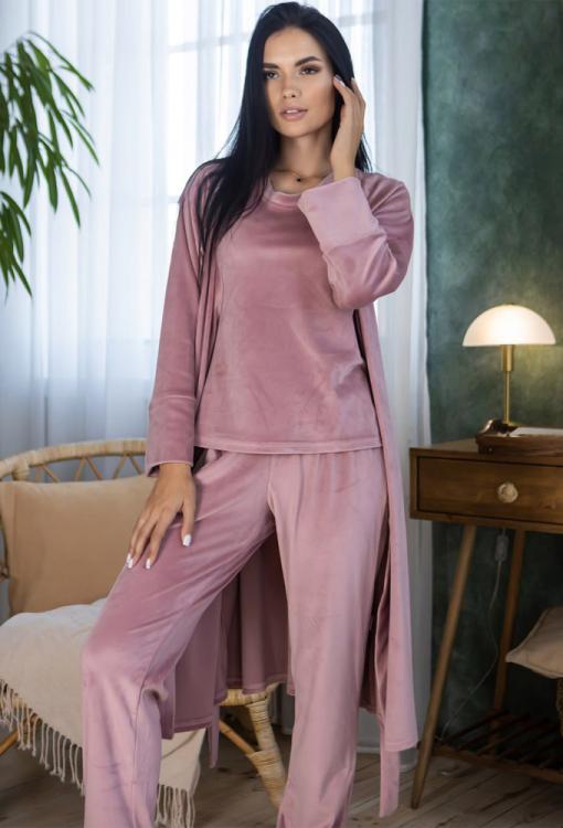 Комфортный комплект пижама и халат от украинского бренда MiaNaGreen. Комплект выполнен из мягкого и качественного велюра, пудрового цвета, состоит из футболки, штанов и халата. Футболка свободного силуэта, с короткими рукавами и круглым вырезом горла. Штаны с мягкой резинкой в поясе, внизу обработаны манжетами. Халат с длинными рукавами и накладным карманом справа, завязывается на запах с помощью пояса, рукава обработаны высокими свободными манжетами. Комплект очень красивый и приятный к телу, идеально подчеркнет домашний образ, а также будет отличным вариантом для подарка любимому и близкому человеку.