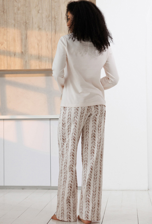 Теплая женская пижама из коллекции Magic Oniks от украинского бренда Roksana. Пижама выполнена из мягкой и качественной байки светло-розового цвета, состоит из однотонной рубашки и штанов в коричневую полоску из листьев. Рубашка прямого силуэта, с длинными рукавами и отложным воротником, застегивается на пуговицы, воротник украшен в тон штанов. Штаны свободного кроя с удобной посадкой и мягкой резинкой в поясе. Пижама очень красивая и комфортная, идеальна для сна и домашнего отдыха, а также может быть полезным подарком любимому и близкому человеку.