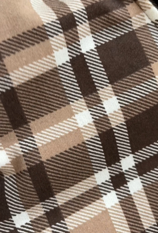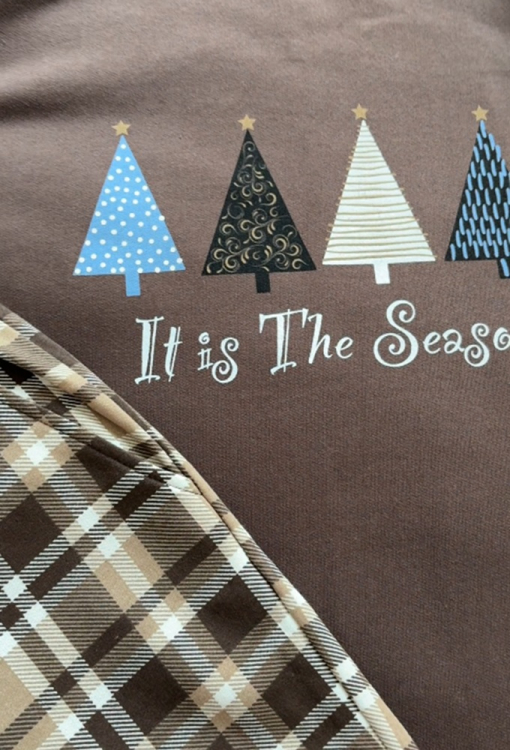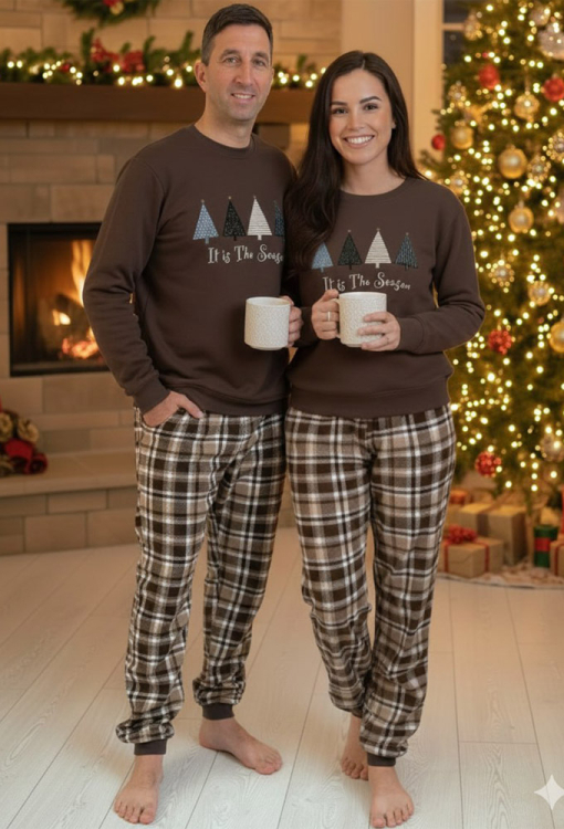 Стильная женская новогодняя пижама Святковий Затишок от украинского бренда Cosy. Пижама выполнена из качественного и мягкого футера с начесом из внутренней стороны, состоит из кофты коричневого цвета и штанов в коричнево-бежевую клетку. Кофта с длинными рукавами и круглым вырезом горла, спереди украшена принтом в виде милых елок и праздничной надписи "It is The Season". Штаны с мягкой резинкой в поясе и удобными боковыми карманами, внизу обработаны манжетами коричневого цвета. Пижама очень красивая и комфортная, идеальна для зимних праздничных вечеров дома, а также может быть замечательным подарком любимому и близкому человеку.