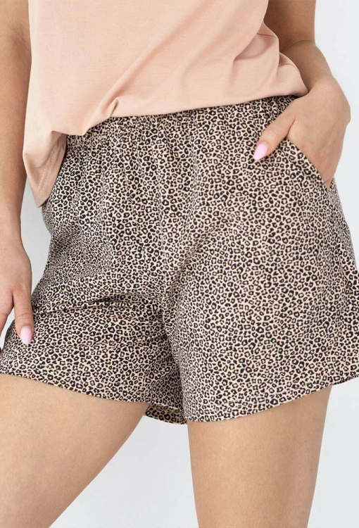 Легкая женская пижама Alessa от польского бренда Sensis. Пижама выполнена из качественного и мягкого материала, состоит из майки из смесового бамбука бежевого цвета и хлопковых шорт с черным леопардовым принтом. Майка свободного силуэта с тонкими регулируемыми бретелями и V-образным декольте, по линии выреза обработана вставками бежевого цвета. Шорты также свободного кроя, с мягкой резинкой в поясе и удобными боковыми карманами. Пижама красивая и невероятно комфортная, идеальный вариант для дома, для сна и как компактный комплект для путешествий, а также может быть полезным подарком любимому или близкому человеку.