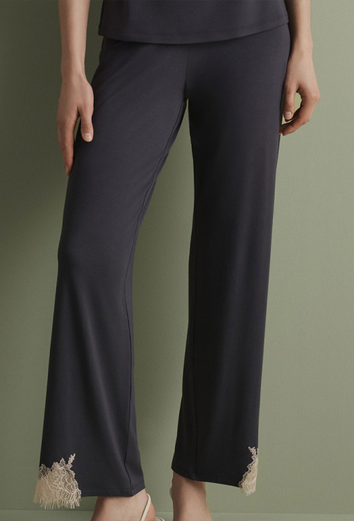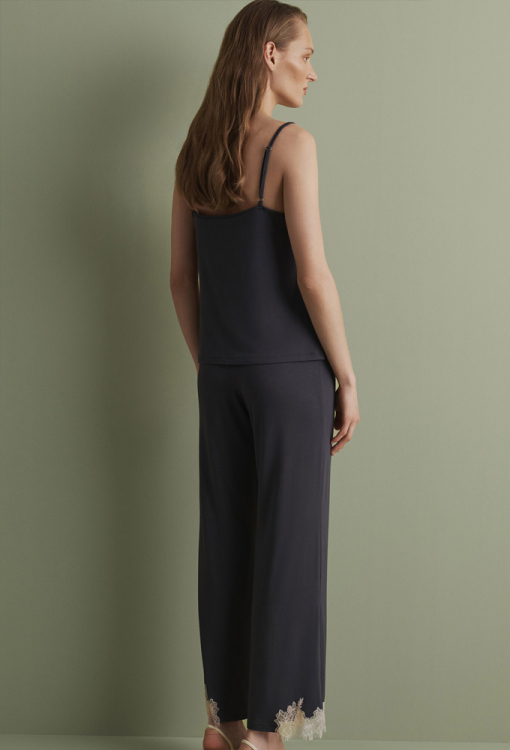 Утонченная женская пижама из коллекции Core от итальянского бренда Effetto. Пижама выполнена из мягкого и качественного бамбука графитового цвета, состоит из майки полуприлегающего силуэта и прямых штанов. Майка на тонких регулируемых бретелях и с V-образным декольте, по линии выреза и слева украшена вставками с аппликациями из нежного кружева Chantilly кремового цвета. Штаны с удобной посадкой и мягкой резинкой в поясе, по бокам внизу также украшены кружевом. Пижама очень красивая и комфортная, прекрасный выбор для сна и домашнего отдыха, а также может быть замечательным подарком любимому и близкому человеку.