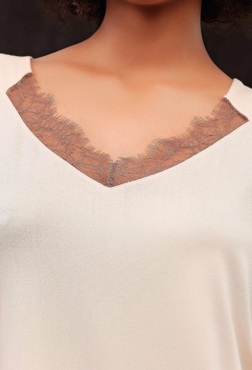 Легкая женская пижама из коллекции Core от итальянского бренда Effetto. Пижама выполнена из мягкого и качественного бамбука бежевого цвета, состоит из майки и шорт прямого силуэта. Майка без рукавов и с V-образным декольте, оформленным тонким кружевом с ресничками коричневого цвета. Внизу передней полки модель украшена широким коричневым кружевом с вырезным краем. Шорты с удобной посадкой и мягкой резинкой в поясе, по бокам внизу обработаны кружевными вставками. Пижама очень красивая и комфортная, прекрасный выбор для сна и домашнего отдыха, а также может быть замечательным подарком любимому и близкому человеку.