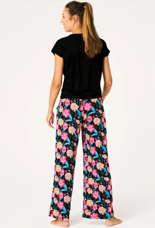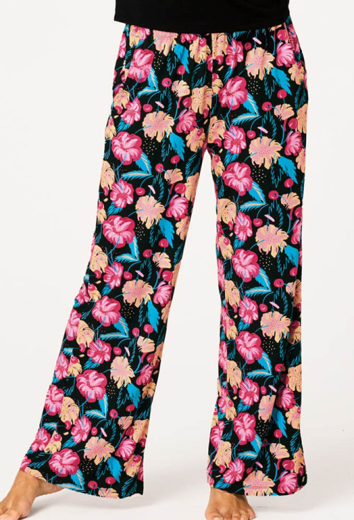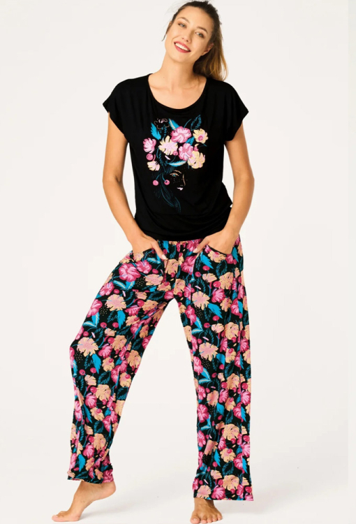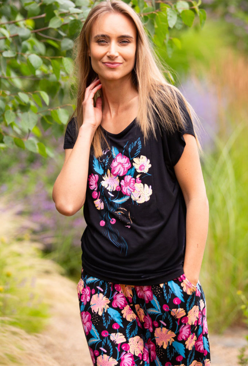 Яркая женская пижама от польского бренда Key. Пижама выполнена из качественного и мягкого бамбука черного цвета, состоит из однотонной футболки и штанов с крупным цветочным принтом розового, персикового и бирюзового цвета. Футболка свободного силуэта с короткими рукавами и круглым вырезом горла, по центру украшена принтом в тон штанов. Штаны свободного кроя с мягкой резинкой в поясе и удобными боковыми карманами. Пижама очень красивая и комфортная, идеально для сна и домашнего отдыха в теплое время года, также может быть полезным подарком любимому и близкому человеку.