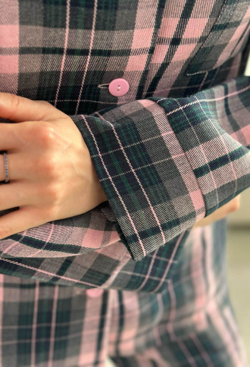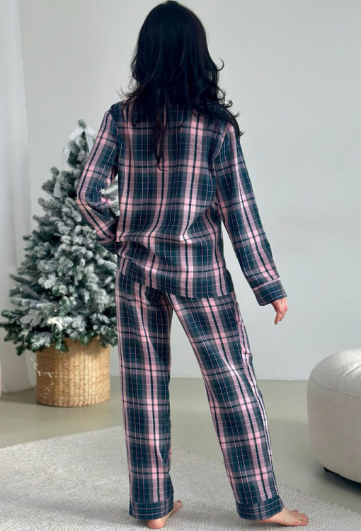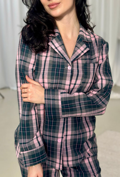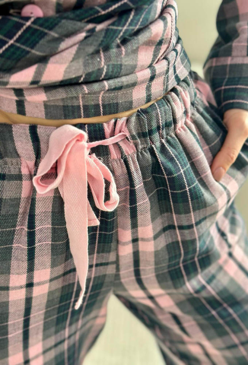 Элегантная женская зимняя пижама от украинского бренда Cosy. Пижама выполнена из высококачественной и мягкой фланели с легким начесом внутри, зеленого цвета в светло-розовый клетчатый принт, состоит из рубашки и штанов прямого силуэта. Рубашка с длинными рукавами и отложным воротником, застегивается на пуговицы, на груди слева украшена накладным карманчиком, рукава обработаны свободными манжетами. Штаны с мягкой резинкой в поясе и удобными боковыми карманами, регулируются по ширине с помощью внутреннего шнурка розового цвета. Пижама очень красивая и комфортная, также может быть замечательным подарком любимому и близкому человеку.