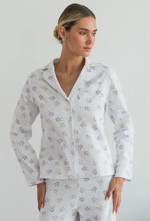 Классическая женская пижама Crown от украинского бренда Forly. Пижама выполнена из качественной и мягкой фланели белого цвета в контурный принт из корон, состоит из рубашки свободного силуэта и прямых брюк. Рубашка с длинными рукавами на манжетах и отложным воротником, застегивается на пуговицы, на груди маленький накладной карманчик. Брюки с высокой посадкой и мягкой резинкой в поясе, внизу обработаны свободными манжетами. Пижама очень красивая, теплая и комфортная, можно использовать как одежду для дома, а также в качестве подарка любимому и близкому человеку.