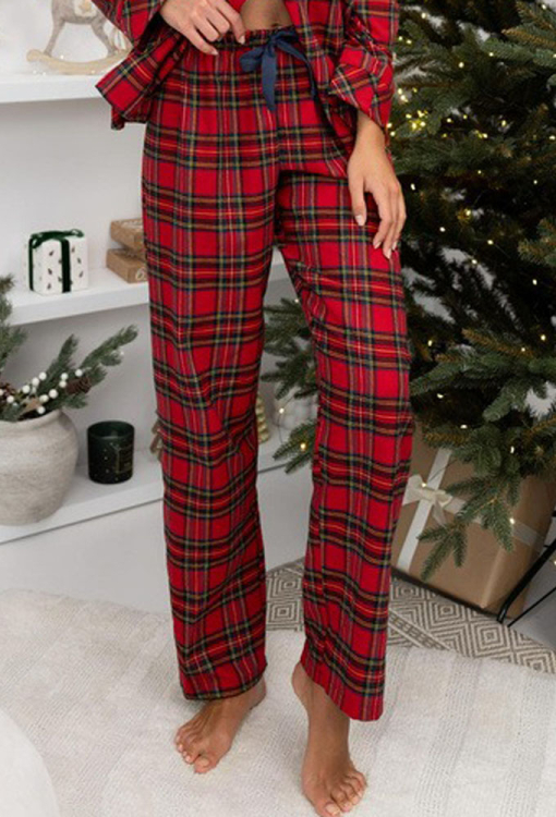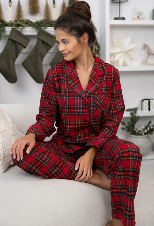 Теплая женская зимняя пижама Dayana от польского бренда Sensis. Пижама выполнена из мягкой и качественной фланели, красного цвета в синий клетчатый принт с оранжевым акцентом, включает рубашку свободного силуэта и прямые штаны. Рубашка с длинными рукавами со свободными манжетами, отложным воротником и нагрудным карманчиком, застегивается на пуговицы, выглядит красиво и аккуратно. Штаны с удобной посадкой и мягкой резинкой в поясе, на талии регулируется внутренним шнурком синего цвета. Пижама создает идеальный баланс тепла и уюта - станет любимой домашней одеждой и прекрасным подарком для близкого человека.