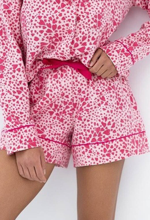 Романтичная женская зимняя пижама Kenzie от польского бренда Sensis. Пижама выполнена из мягкой и качественной фланели, белого цвета в принт из розовых сердечек, включает рубашку свободного силуэта и прямые шорт. Рубашка с длинными рукавами, украшенными розовым кантом, и отложным воротником, застегивается на пуговицы, выглядит аккуратно и дарит удобство в носке. Шорты с мягкой резинкой в поясе и атласным бантиком на талии, внизу украшены кантом розового цвета. Пижама создает идеальный баланс тепла и уюта - станет любимой домашней одеждой и прекрасным подарком для близкого человека.