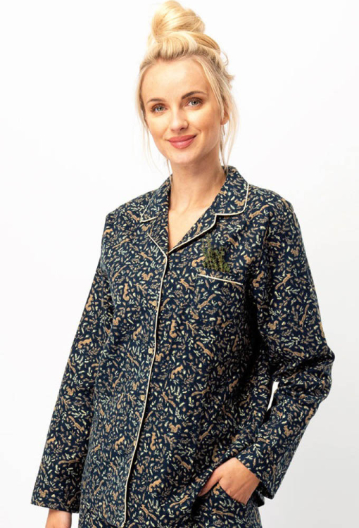Очень теплая женская пижама от польского бренда Key. Пижама выполненная из качественной, мягкой и пушистой фланели, графитового цвета с осенним принтом в виде белок в листьях бежевого цвета, состоит из рубашки классического силуэта и штанов прямого кроя. Рубашка с длинными рукавами и отложным воротником, застегивается на пуговицы. На груди слева модель украшена маленьким накладным карманчиком, воротник, полки и карман обработаны однотонным кантом бежевого цвета. Штаны с мягкой резинкой в поясе и удобными боковыми карманами. Пижама очень красивая и комфортная, подходит как для сна, так и для ленивого утра и уютных зимних вечеров дома, также может быть полезным подарком любимому и близкому человеку.