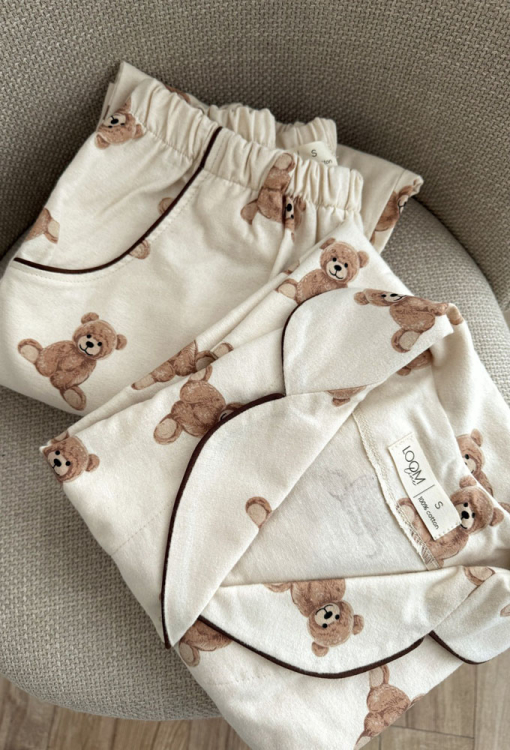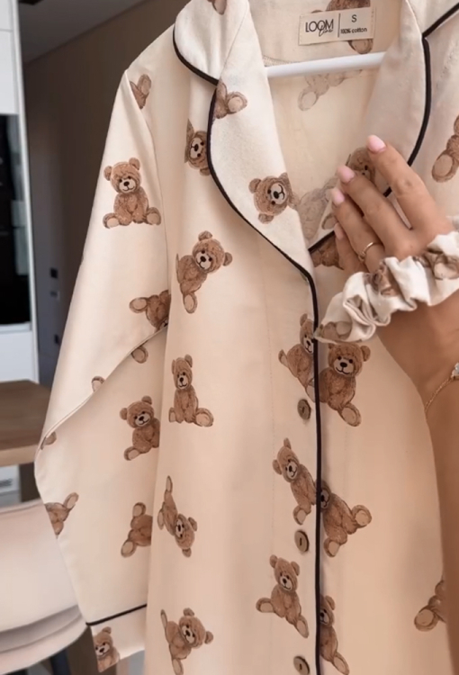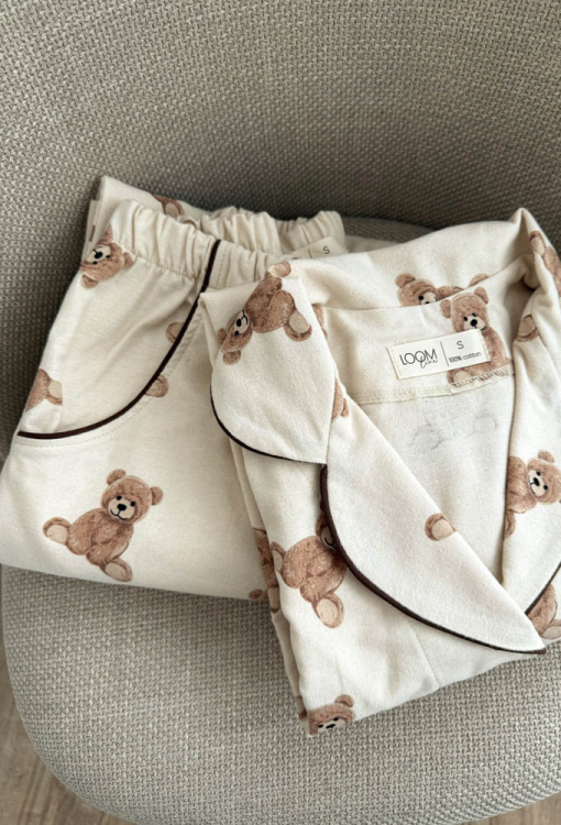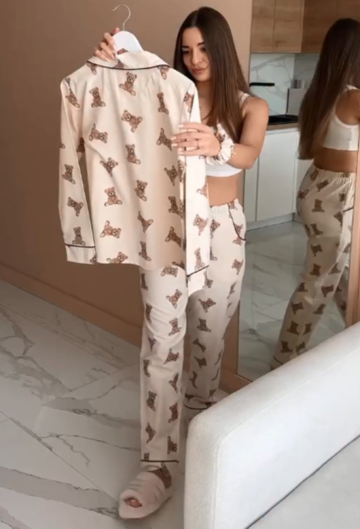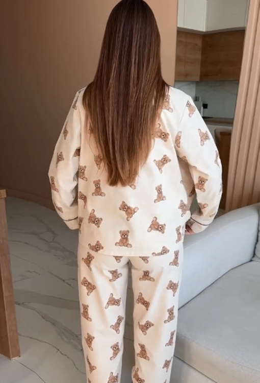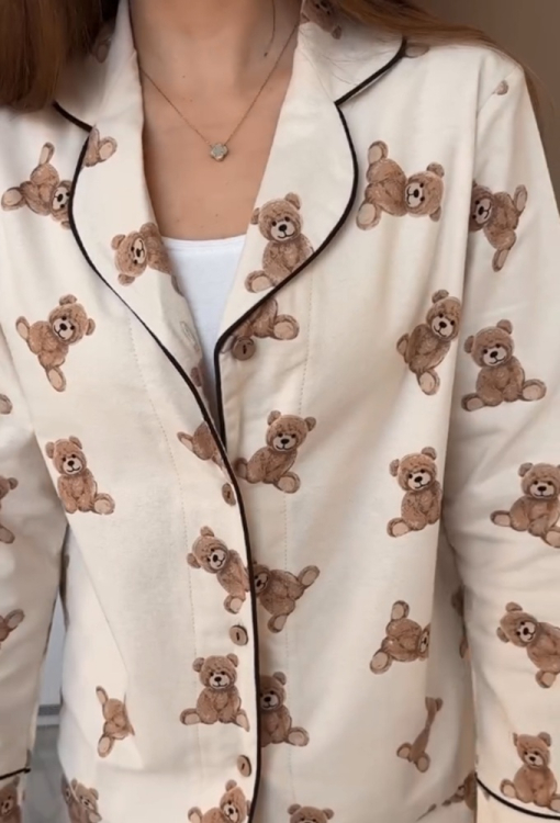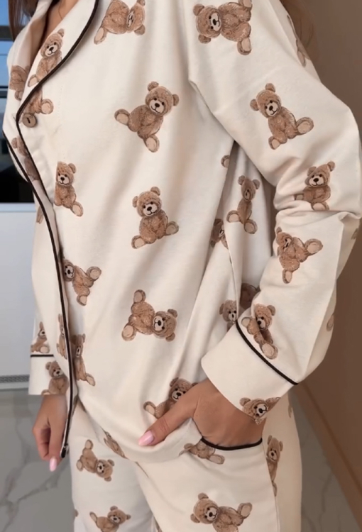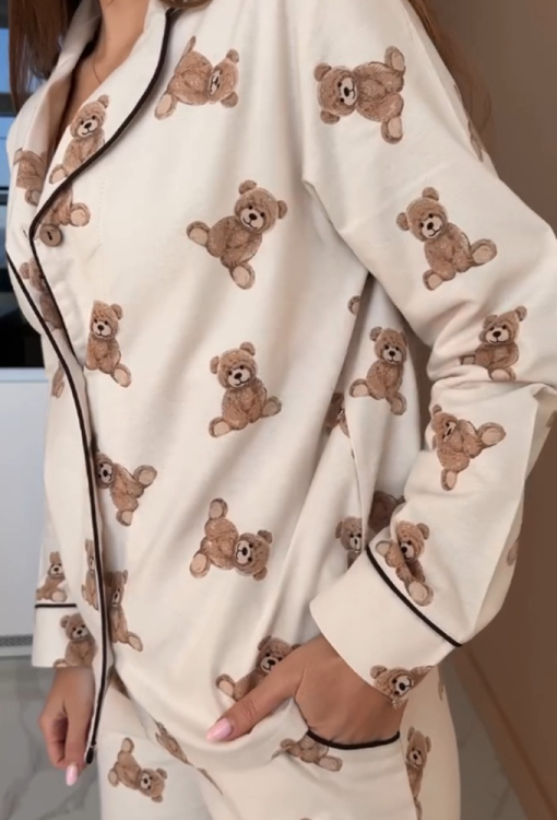 Очаровательная женская зимняя пижама от украинского бренда LoomLine. Пижама выполнена из качественной и мягкой фланели, бежевого цвета в принт плюшевых медвежат, состоит из классической рубашки и прямых штанов. Рубашка с длинными рукавами и отложным воротником, застегивается на пуговицы, воротник, полки и рукава украшены тонким кантом черного цвета. Штаны с мягкой резинкой в поясе и удобными боковыми карманами, низ и карманы оформлены контрастным кантом. Пижама стильная и теплая, идеальна для сна и домашнего уюта в холодное время года, а также может быть замечательным подарком любимому и близкому человеку.