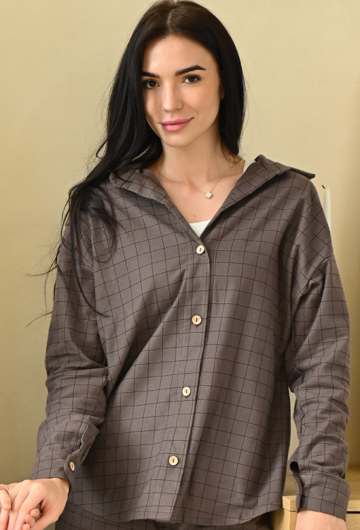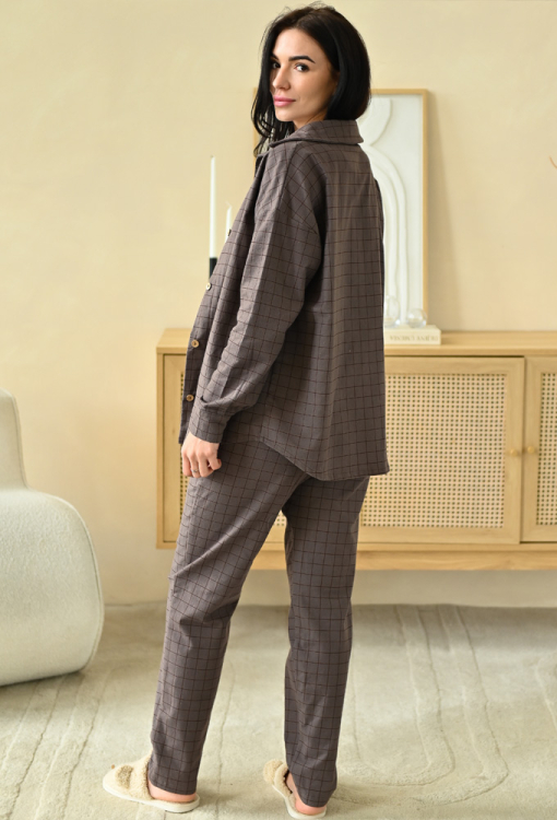 Комфортная женская пижама от украинского бренда LoomLine. Пижама выполнена из качественной и мягкой фланели, шоколадного цвета в принт из квадратов, состоит из рубашки и прямых штанов. Рубашка свободного кроя оверсайз, с длинными рукавами и отложным воротником, застегивается на пуговицы, рукава обработаны манжетами на пуговицах. Штаны с мягкой резинкой в поясе и удобными боковыми карманами. Пижама стильная и теплая, идеальна для сна и домашнего уюта в холодное время года, а также может быть замечательным подарком любимому и близкому человеку.