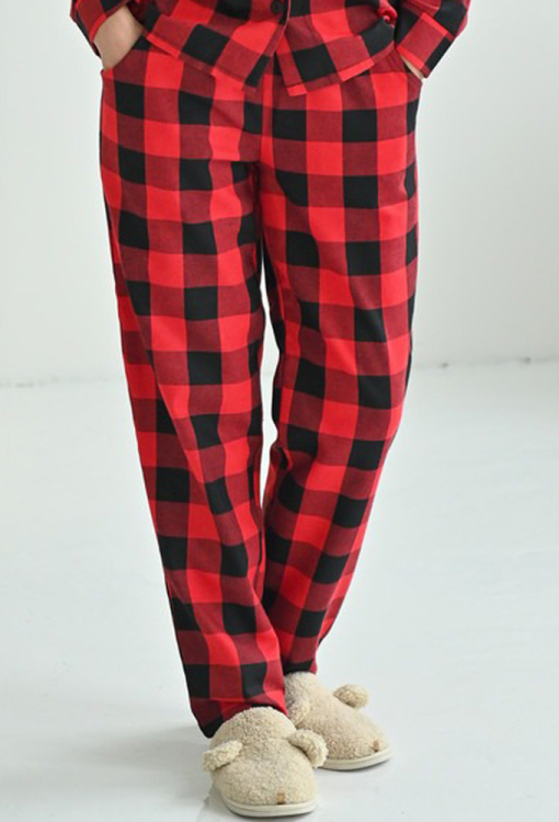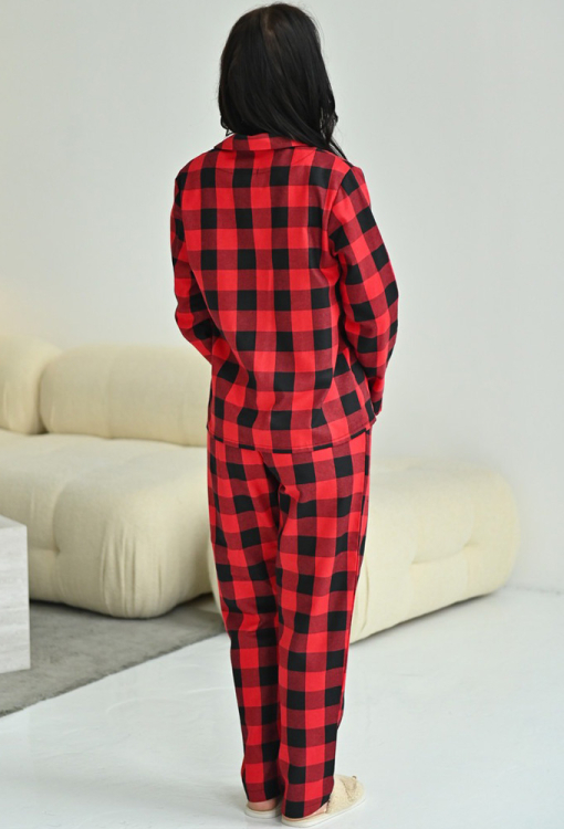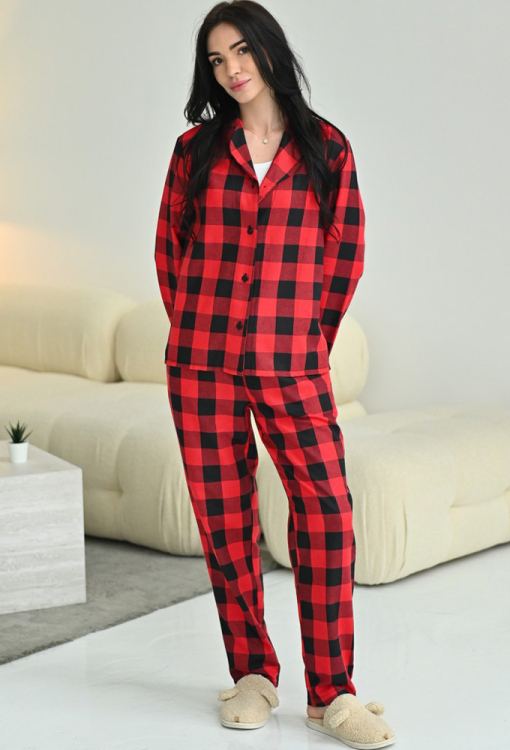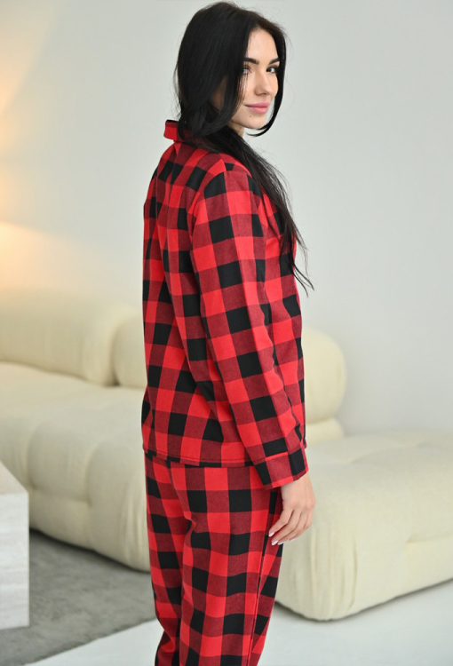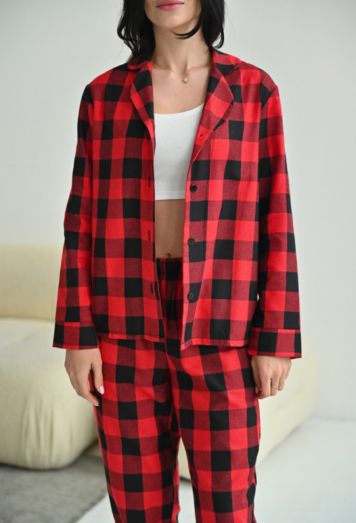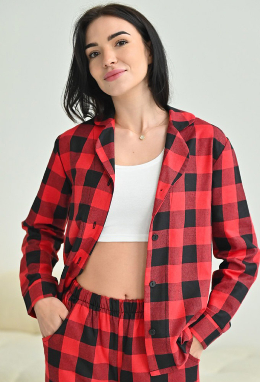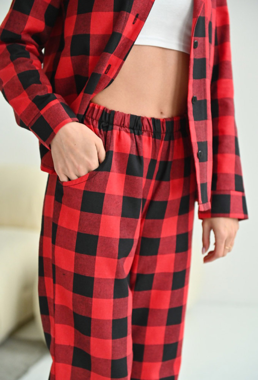 Яркая и стильная женская пижама от украинского бренда LoomLine. Пижама выполнена из качественной и мягкой фланели, красного цвета в черный клетчатый принт, состоит из рубашки со штанами прямого силуэта. Рубашка с длинными рукавами и отложным воротником, застегивается на пуговицы, рукава обработаны свободными манжетами. Штаны с мягкой резинкой в поясе и удобными боковыми карманами. Пижама красивая и очень комфортная, идеальна для сна и домашнего уюта в холодное время года, а также может быть замечательным подарком любимому и близкому человеку.