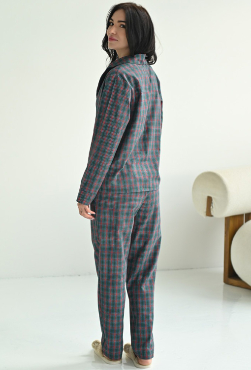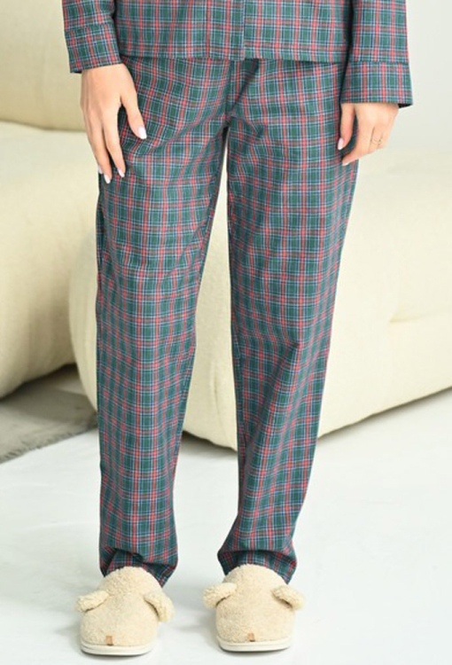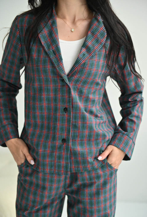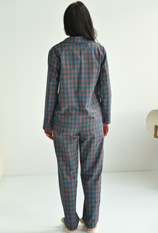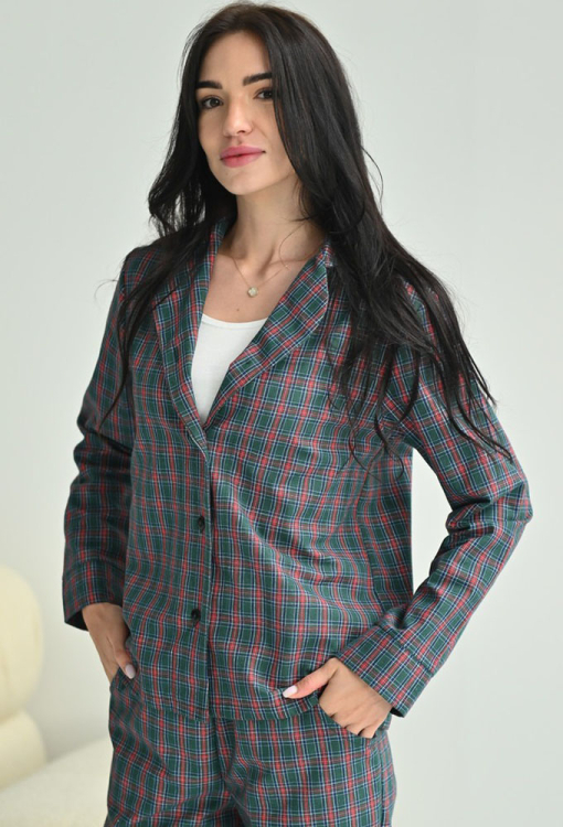 Яркая и стильная женская пижама от украинского бренда LoomLine. Пижама выполнена из качественной и мягкой фланели, зеленого цвета в красный клетчатый принт, состоит из рубашки со штанами прямого силуэта. Рубашка с длинными рукавами и отложным воротником, застегивается на пуговицы, рукава обработаны свободными манжетами. Штаны с мягкой резинкой в поясе и удобными боковыми карманами. Пижама красивая и очень комфортная, идеальна для сна и домашнего уюта в холодное время года, а также может быть замечательным подарком любимому и близкому человеку.
