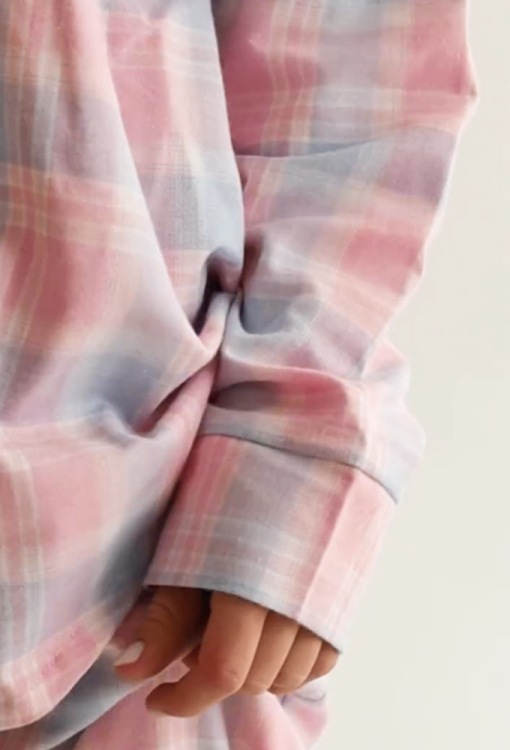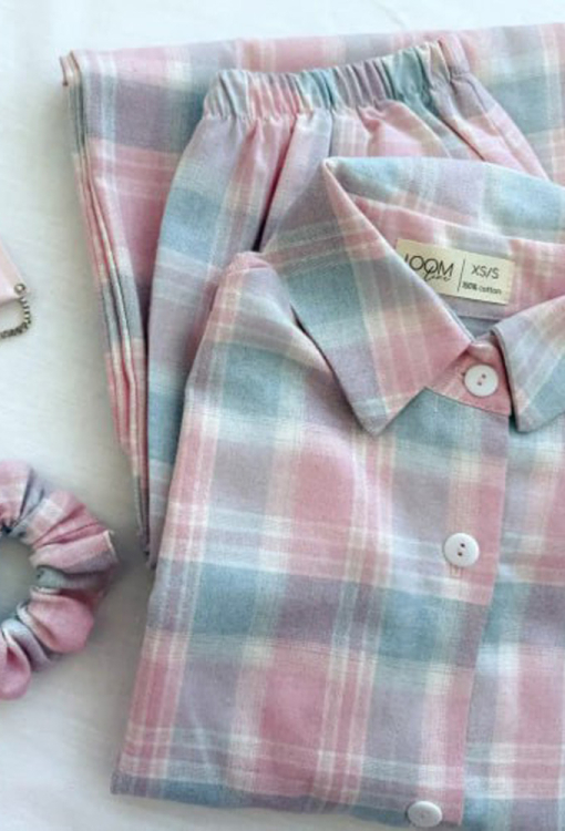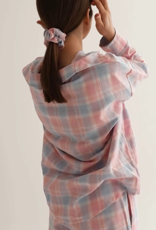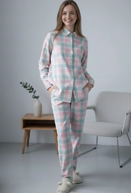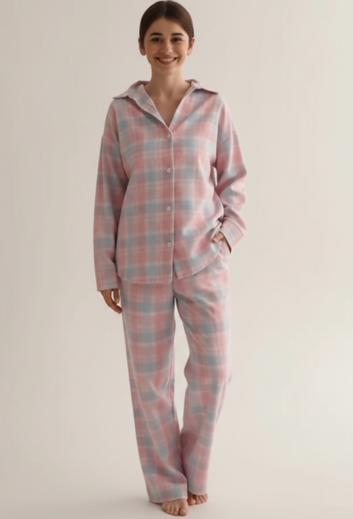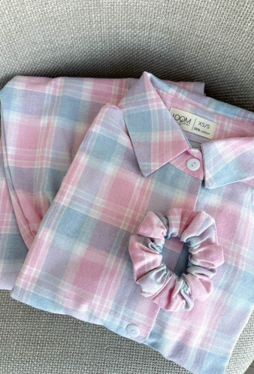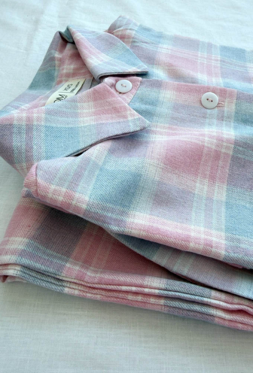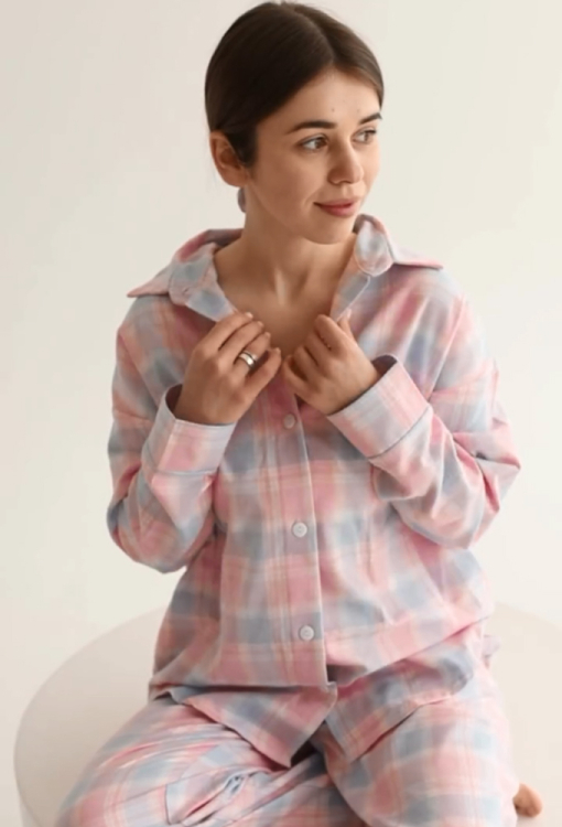 Стильная женская зимняя пижама от украинского бренда LoomLine. Пижама выполнена из качественной и мягкой фланели, голубого цвета в розовый клетчатый принт, состоит из рубашки и прямых штанов. Рубашка оверсайз кроя, с длинными рукавами, заниженным плечевым швом и отложным воротником, застегивается на пуговицы, рукава обработаны свободными манжетами. Штаны с мягкой резинкой в поясе и удобными боковыми карманами. Пижама теплая и очень комфортная, идеальна для сна и домашнего уюта в холодное время года, а также может быть замечательным подарком любимому и близкому человеку.
