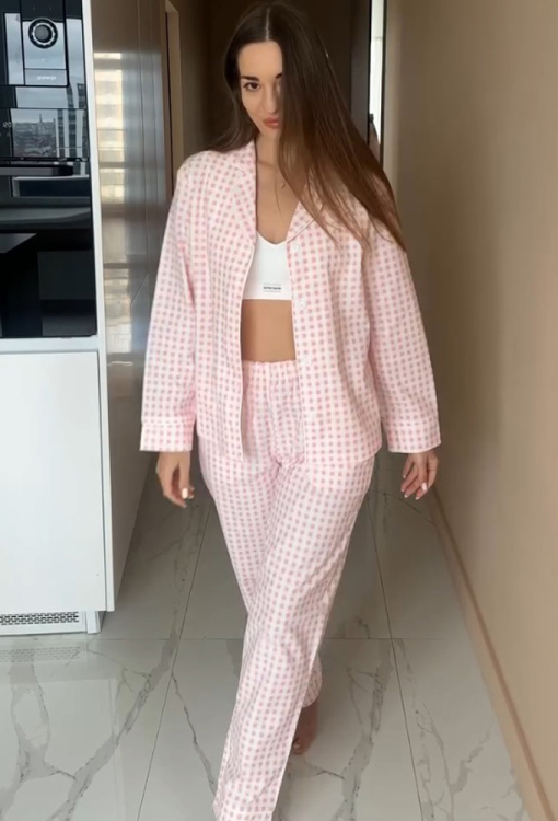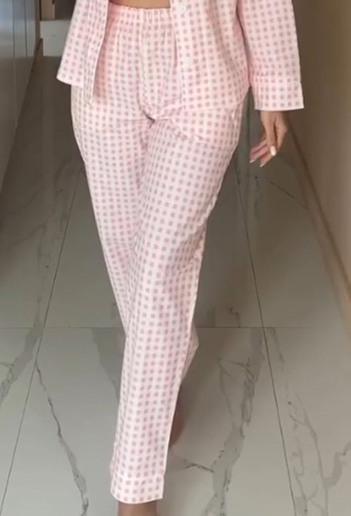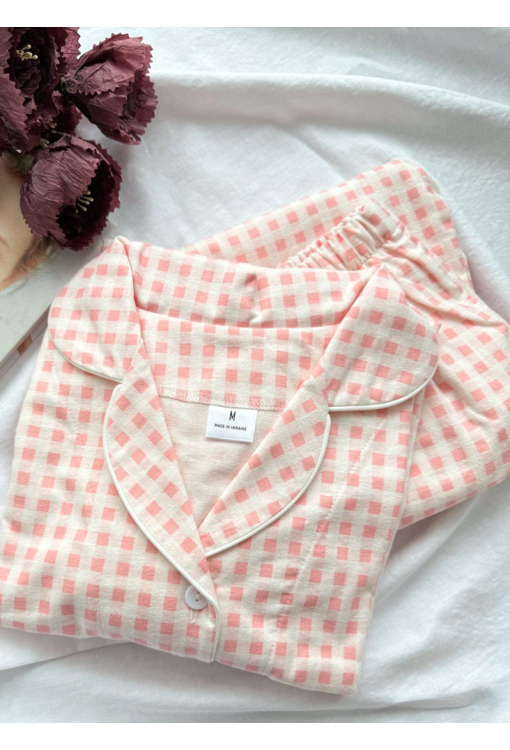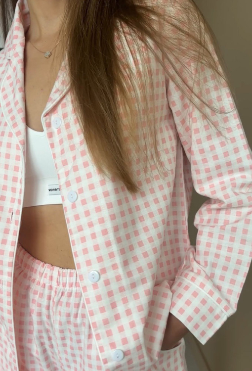 Красивая и теплая женская зимняя пижама от украинского бренда LoomLine. Пижама выполнена из качественной и мягкой фланели, белого цвета с мелким клетчатым принтом розового цвета, состоит из рубашки классического кроя и прямых штанов. Рубашка с длинными рукавами и отложным воротником, застегивается на пуговицы, воротник, полки и рукава изделия украшены тонким кантом белого цвета. Штаны с мягкой резинкой в поясе и удобными боковыми карманами, внизу и на карманах обработаны белым кантом. Пижама стильная и очень комфортная, идеальна для сна и домашнего уюта в холодное время года, а также может быть замечательным подарком любимому и близкому человеку.