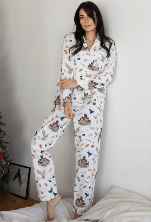 Новогодняя женская пижама от украинского бренда Mi-Mi. Пижама выполнена из качественной и мягкой фланели, белого цвета в яркий принт Гарри Поттер, состоит из рубашки и прямых штанов. Рубашка свободного кроя, с длинными рукавами и отложным воротником, застегивается на пуговицы, на груди слева украшена накладным карманчиком. Воротник, полки, рукава и карман рубашки обработаны тонким кантом белого цвета. Штаны с мягкой резинкой в поясе и тонким белым кантом внизу. Пижама теплая и очень комфортная, можно использовать как одежду для дома, а также в качестве подарка любимому и близкому человеку.