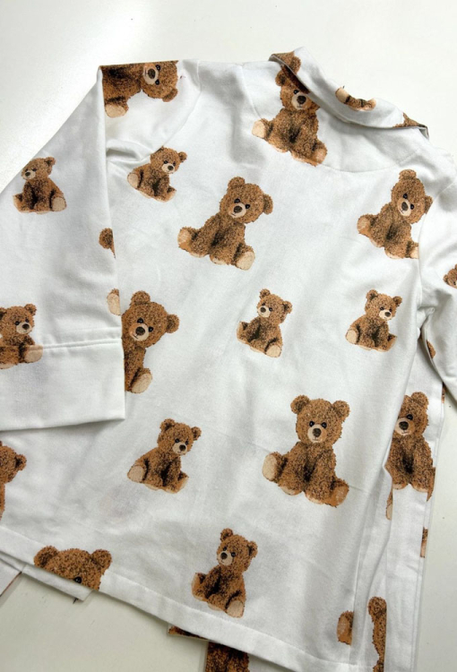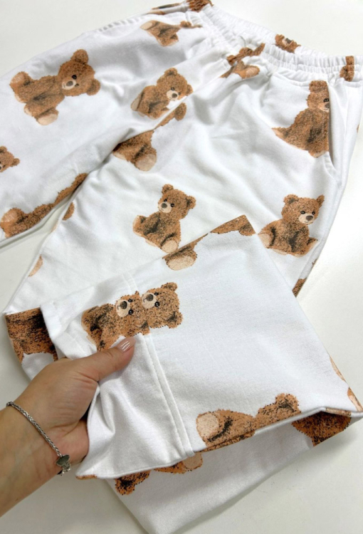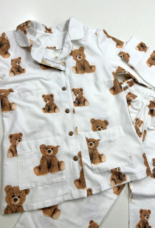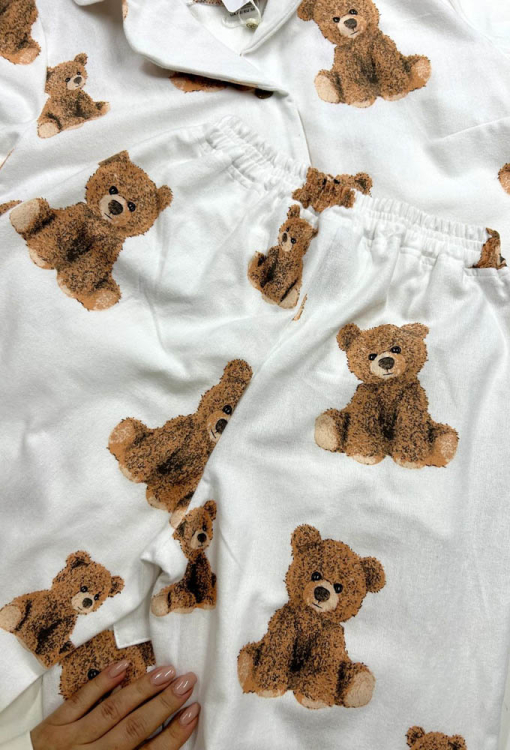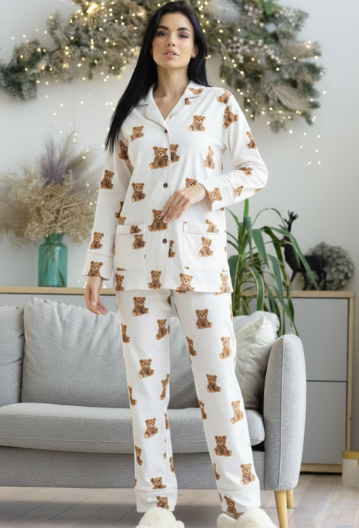 Теплая женская зимняя пижама от украинского бренда MiaNaGreen. Пижама выполнена из качественной и мягкой фланели, белого цвета в принт из милых плюшевых мишек коричневого цвета, состоит из рубашки и штанов прямого силуэта. Рубашка с длинными рукавами и отложным воротником, застегивается на пуговицы, по бокам два накладных кармана. Штаны с мягкой резинкой в поясе и удобными боковыми карманами. Пижама очень красивая и комфортная, можно использовать как одежду для дома, а также в качестве подарка любимому и близкому человеку.
