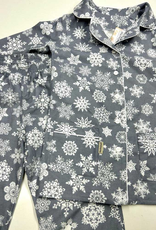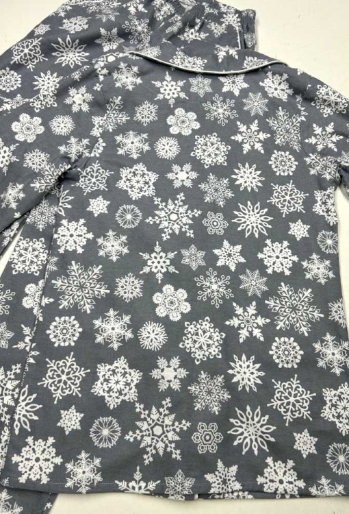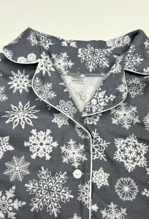 Теплая женская новогодняя пижама от украинского бренда MiaNaGreen. Пижама выполнена из качественной и мягкой фланели, серого цвета в принт из белых снежинок, состоит из рубашки со штанами прямого силуэта. Рубашка с длинными рукавами и отложным воротником, застегивается на пуговицы, по бокам два накладных кармана. Воротник, полки, рукава и карманы модели украшены тонким кантом белого цвета. Штаны с удобной посадкой и мягкой резинкой в поясе. Пижама очень красивая и комфортная, можно использовать как одежду для дома, а также в качестве подарка любимому и близкому человеку на рождественские праздники.