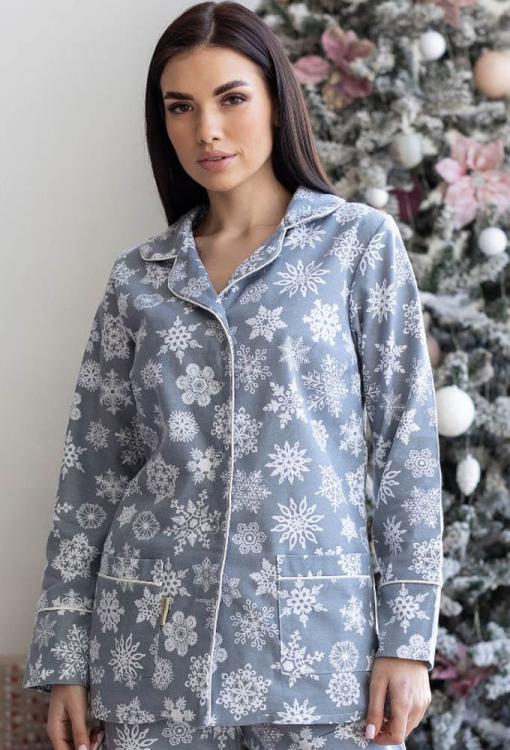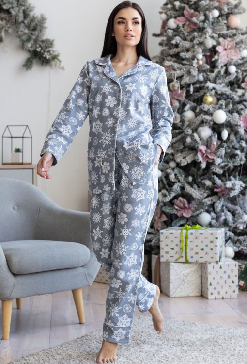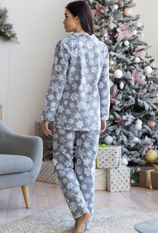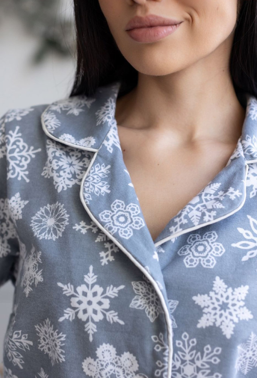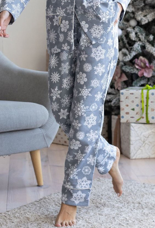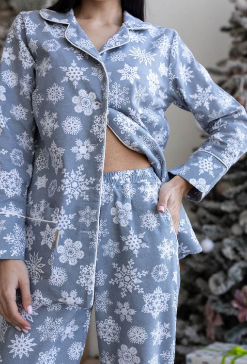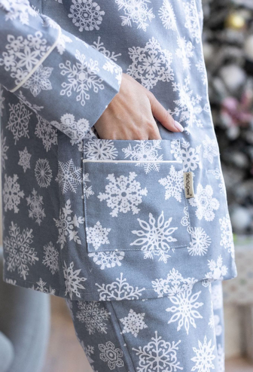 Теплая женская новогодняя пижама от украинского бренда MiaNaGreen. Пижама выполнена из качественной и мягкой фланели, серого цвета в принт из белых снежинок, состоит из рубашки со штанами прямого силуэта. Рубашка с длинными рукавами и отложным воротником, застегивается на пуговицы, по бокам два накладных кармана. Воротник, полки, рукава и карманы модели украшены тонким кантом белого цвета. Штаны с удобной посадкой, мягкой резинкой в поясе и удобными боковыми карманами. Пижама очень красивая и комфортная, можно использовать как одежду для дома, а также в качестве подарка любимому и близкому человеку на рождественские праздники.