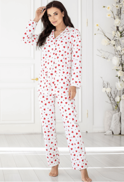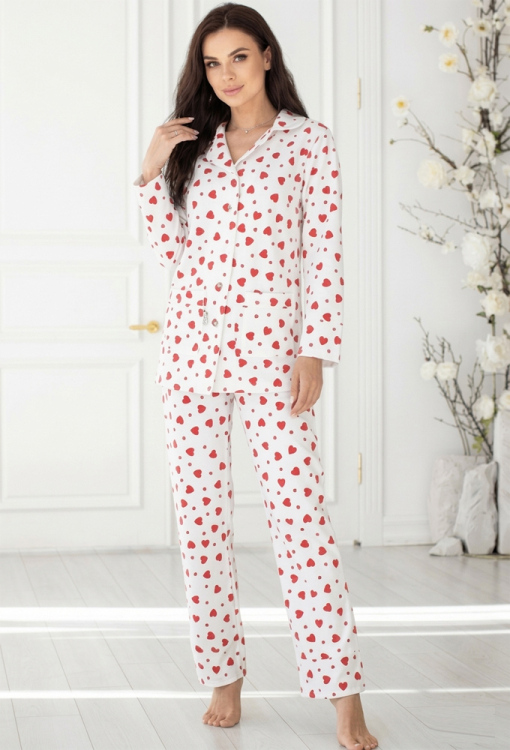 Теплая зимняя женская пижама от украинского бренда MiaNaGreen. Пижама выполнена из качественной и мягкой фланели, белого цвета в принт из красных сердечек, состоит из удлиненной рубашки и штанов прямого силуэта. Рубашка с длинными рукавами и отложным воротником, застегивается на пуговицы, по бокам два накладных кармана. Штаны с мягкой резинкой в поясе и удобными боковыми карманами. Пижама очень красивая и комфортная, можно использовать как одежду для дома, а также в качестве подарка любимому и близкому человеку.