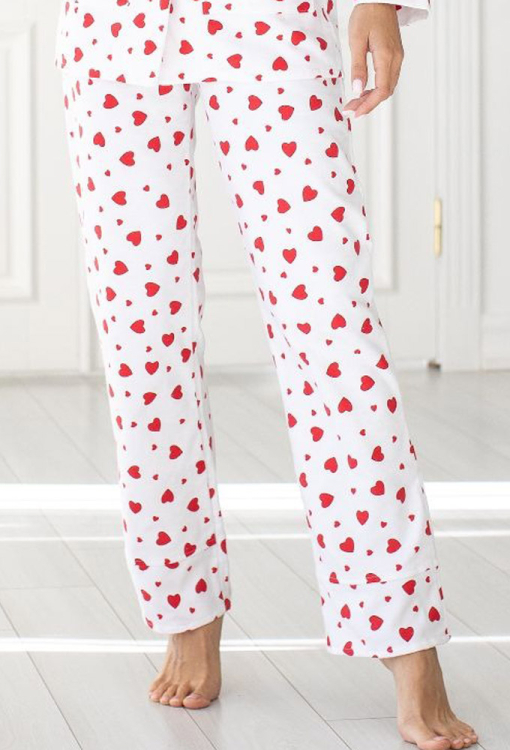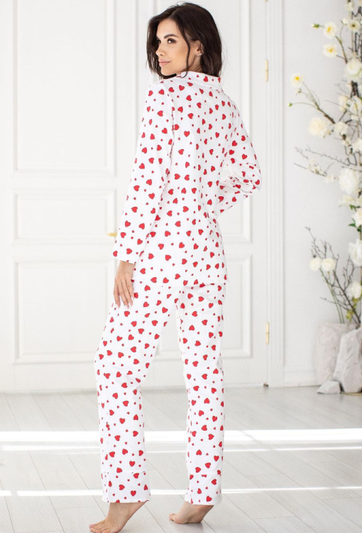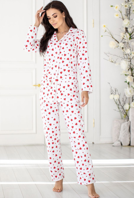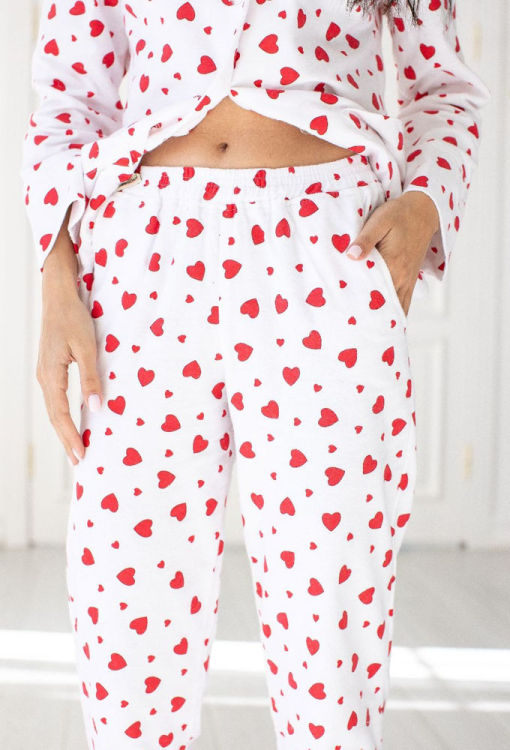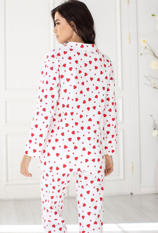 Теплая зимняя женская пижама от украинского бренда MiaNaGreen. Пижама выполнена из качественной и мягкой фланели, белого цвета в принт из красных сердечек, состоит из удлиненной рубашки и штанов прямого силуэта. Рубашка также прямого кроя, с длинными рукавами и отложным воротником, застегивается на пуговицы, по бокам два накладных кармана. Штаны с мягкой резинкой в поясе и удобными боковыми карманами. Пижама очень красивая и комфортная, можно использовать как одежду для дома, а также в качестве подарка любимому и близкому человеку.