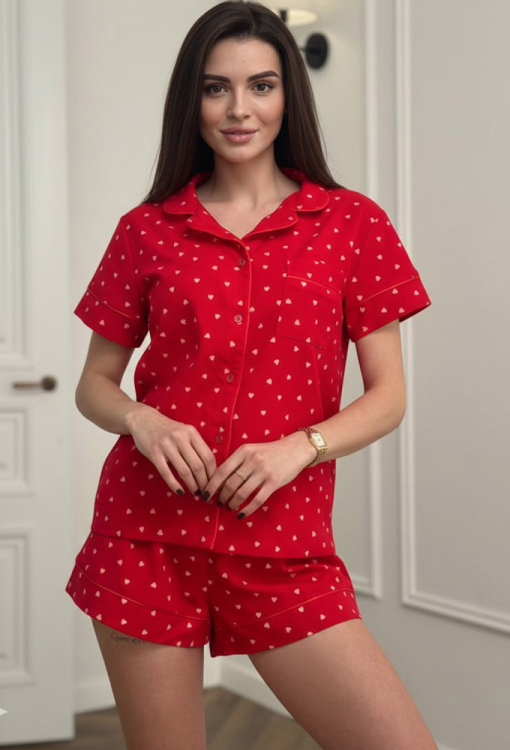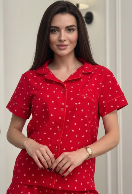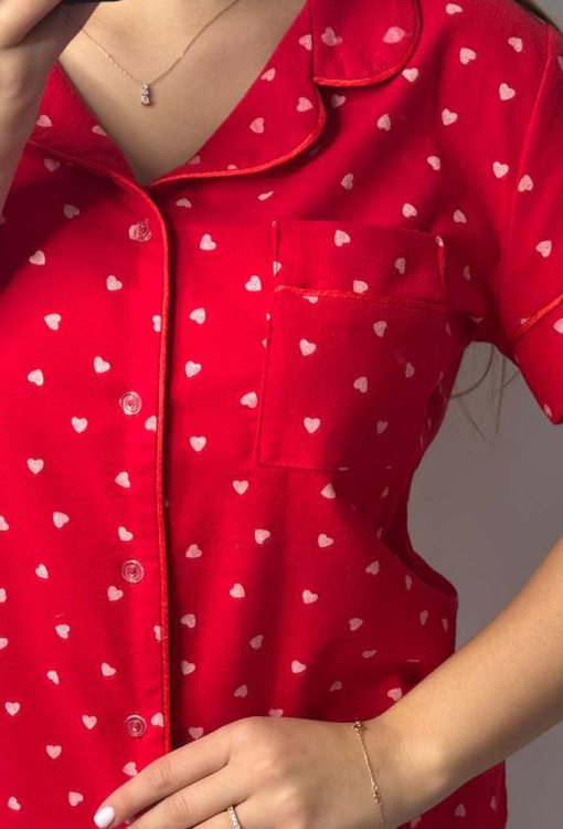 Яркая женская пижама от украинского бренда V.Velika. Пижама выполнена из мягкой и качественной фланели, красного цвета с принтом в виде белых сердечек, состоит из рубашки прямого силуэта и коротких шорт. Рубашка с короткими рукавами и отложным воротником, застегивается на пуговицы, на груди украшена маленьким накладным карманчиком. Воротник, полки, рукава и карман модели обработаны тонким кантом красного цвета. Шорты прямого кроя и с мягкой резинкой в поясе, внизу оформлены свободными манжетами с красным кантом. Пижама очень красивая и комфортная, подойдет в качестве домашней одежды, а также может быть отличным подарком любимому или близкому человеку.