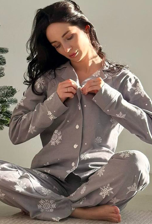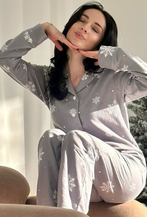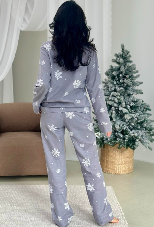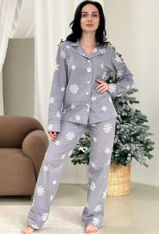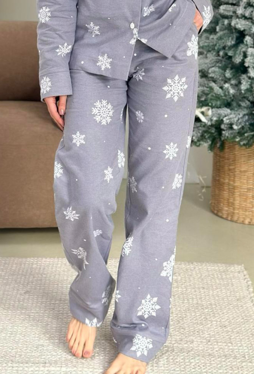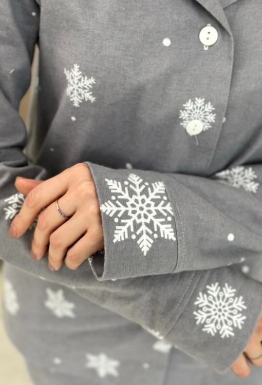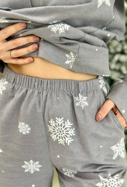 Теплая женская новогодняя пижама Зимняя Сказка от украинского бренда Cosy. Пижама выполнена из высококачественной и мягкой фланели с легким двусторонним начесом, серого цвета в принт из крупных снежинок белого цвета, состоит из рубашки и штанов. Рубашка свободного кроя, с длинными рукавами и отложным воротником, застегивается на пуговицы. Штаны прямые, средней посадки, с мягкой резинкой в поясе и удобными боковыми карманами, внизу обработаны свободными манжетами. Пижама очень красивая и комфортная, также может быть замечательным подарком любимому и близкому человеку.