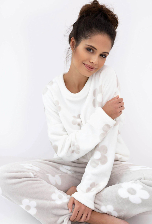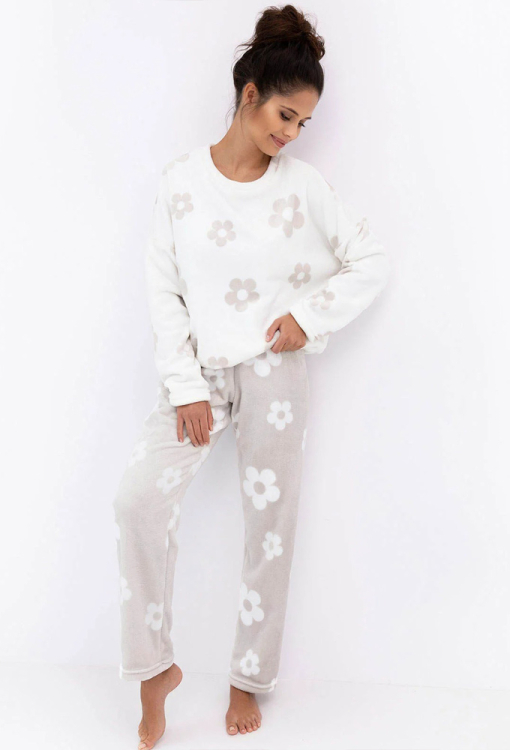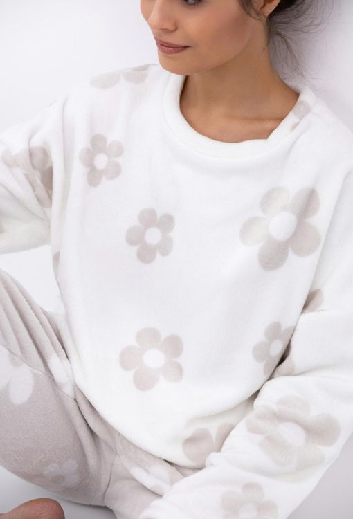 Женская теплая пижама Melody от польского бренда Sensis - это идеальное сочетание уюта, тепла и стильного домашнего образа. Пижама, выполненная из качественного и мягкого флиса, состоит из кофты белого цвета в бежевый цветочный принт и бежевых штанов в крупные цветы белого цвета. Кофта свободного силуэта, с длинными рукавами и круглым вырезом горла дарит особое тепло и комфорт. Штаны прямого кроя и с мягкой резинкой на талии обеспечивают свободу движений и удобную посадку. Пижама не только уютная и невероятно приятная к телу - она моментально становится любимым комплектом для отдыха и прекрасным подарком для близкого человека.
