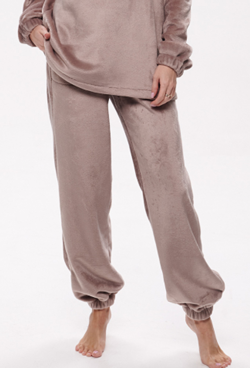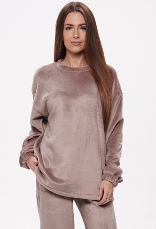 Теплая женская пижама от украинского бренда Wiktoria. Пижама выполнена из качественного и мягкого флиса цвета капучино, состоит из удлиненной кофты и штанов на манжетах. Кофта свободного силуэта, с длинными рукавами на манжетах и круглым вырезом горла, штаны с мягкой резинкой в поясе и удобными боковыми карманами. Пижама очень красивая и комфортная, также будет удобной одеждой для дома или отличным подарком любимому и близкому человеку.
