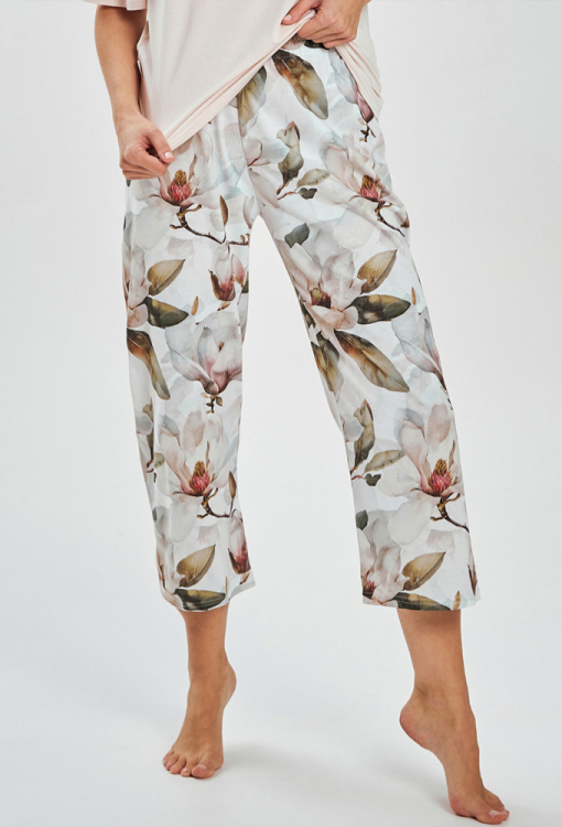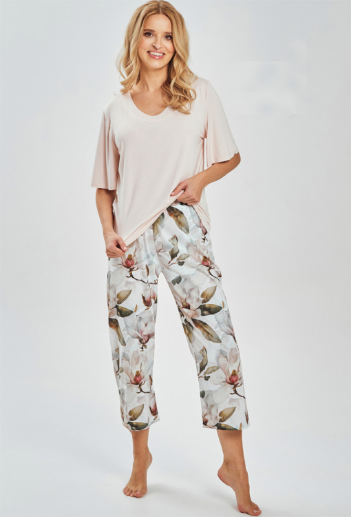 Комфортная женская пижама Afrodyta от польского бренда Taro. Пижама выполнена из качественного и мягкого хлопка, состоит из футболки бежевого цвета и белых капри с принтом в виде крупных цветов магнолии розового и бежевого цвета. Футболка свободного силуэта, с короткими расширенными рукавами и V-образным вырезом горла, капри с удобной посадкой и мягкой резинкой в поясе. Пижама очень красивая и удобная, идеальна для теплых летних ночей и домашнего отдыха, а также может быть замечательным подарком любимому или близкому человеку.