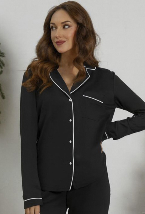 Классическая женская пижама из коллекции Assorty от украинского бренда Roksana. Пижама выполнена из мягкого и качественного хлопка черного цвета, состоит из рубашки со штанами прямого силуэта. Рубашка с длинными рукавами и отложным воротником, застегивается на пуговицы, на груди слева украшена маленьким накладным карманчиком, штаны с мягкой резинкой в поясе. Воротник, полки, рукава и карман рубашки, а также низ штанов обработаны тонким кантом белого цвета. Пижама очень красивая и комфортная, идеальна для сна и домашнего отдыха, а также может быть полезным подарком любимому и близкому человеку.