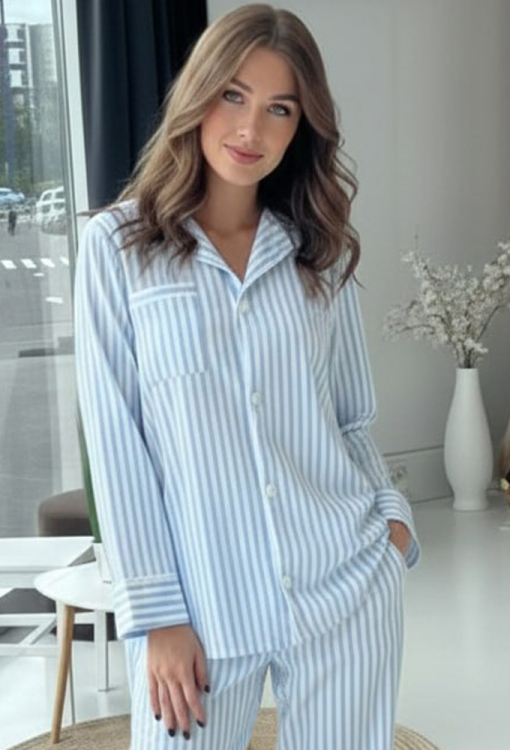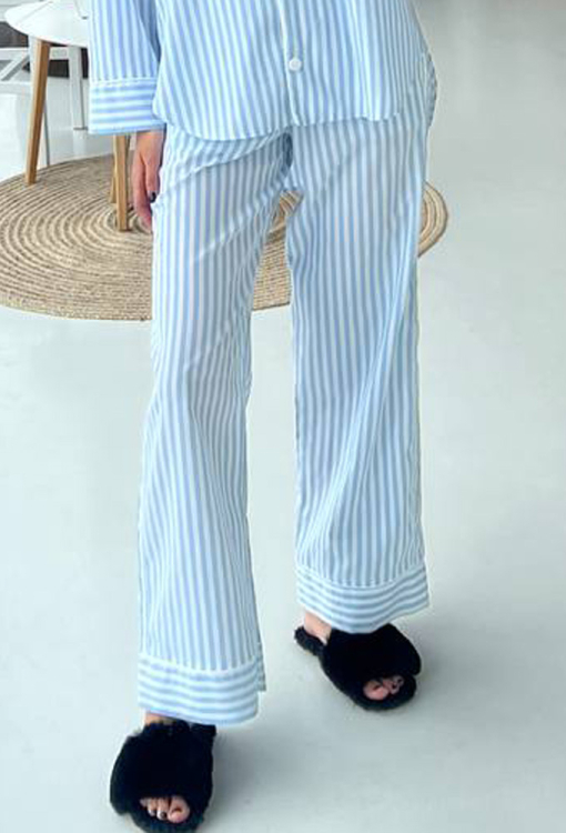 Классическая женская пижама от украинского бренда BO.Brand. Пижама выполнена из качественного и мягкого хлопка, белого цвета в голубой полосатый, состоит из рубашки со штанами прямого силуэта. Рубашка с длинными рукавами на свободных манжетах и отложным воротником, застегивается на пуговицы, на груди слева украшена маленьким карманчиком. Воротник, полки, рукава и карман модели обработаны тонким кантом белого цвета. Штаны с мягкой резинкой в поясе и удобными боковыми карманами, регулируются по ширине с помощью внутреннего шнурка, внизу свободные манжеты оформленные белым кантом. Пижама красивая и очень комфортная, идеальна для сна и домашнего отдыха, а также может быть замечательным подарком любимому и близкому человеку.