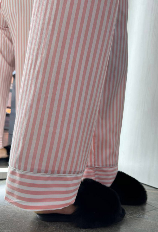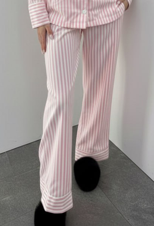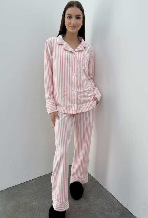 Классическая женская пижама от украинского бренда BO.Brand. Пижама выполнена из качественного и мягкого хлопка, белого цвета в розовый полосатый, состоит из рубашки со штанами прямого силуэта. Рубашка с длинными рукавами на свободных манжетах и отложным воротником, застегивается на пуговицы, на груди слева украшена маленьким карманчиком. Воротник, полки, рукава и карман модели обработаны тонким кантом белого цвета. Штаны с мягкой резинкой в поясе и удобными боковыми карманами, регулируются по ширине с помощью внутреннего шнурка, внизу свободные манжеты оформленные белым кантом. Пижама красивая и очень комфортная, идеальна для сна и домашнего отдыха, а также может быть замечательным подарком любимому и близкому человеку.