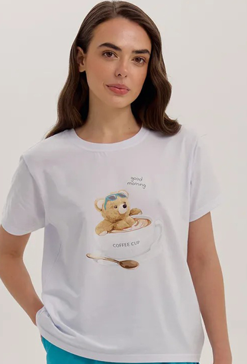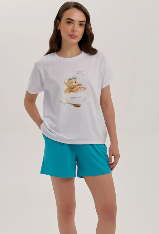 Удобная женская пижама из коллекции Coffe Cup от украинского бренда Ellen. Пижама выполнена из качественного и мягкого хлопка, состоит из футболки белого цвета, прямого силуэта и коротких бирюзовых шорт. Футболка с короткими рукавами и круглым вырезом горла, по центру украшена забавным принтом в виде мишки в кофейной чашке с надписью "Coffe Cup". Шорты прямого кроя, с мягкой резинкой в поясе и удобными боковыми карманами. Пижама очень красивая и комфортная, также может быть отличной одеждой для дома или полезным подарком любимому и близкому человеку.