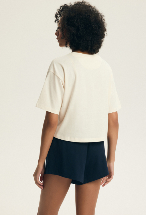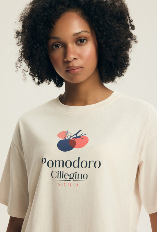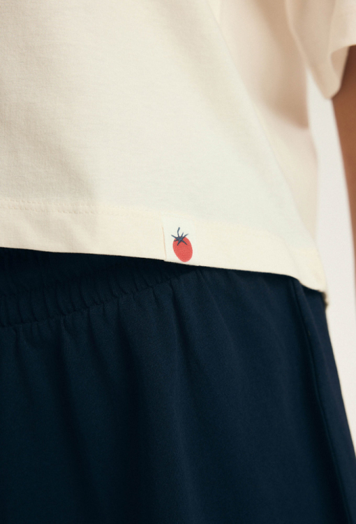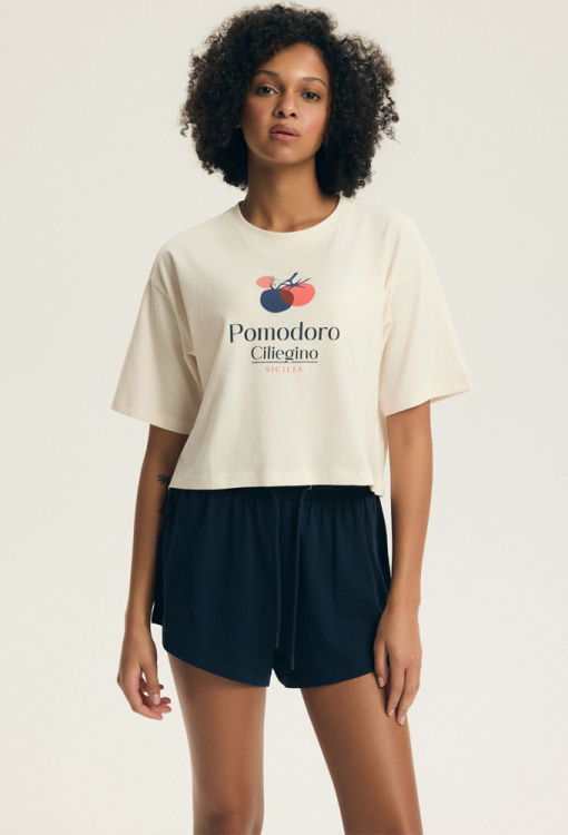 Стильная женская пижама Dessie от польского бренда Henderson Ladies. Пижама выполнена из мягкого и качественного хлопка, состоит из укороченной футболки свободного силуэта, кремового цвета и темно-синих шорт свободного кроя. Футболка с короткими рукавами, заниженным плечевым швом и круглым вырезом горла, на уровне груди украшена принтом из помидор и надписью "pomodoro ciliegino sicilia". Шорты с удобной посадкой и мягкой резинкой в поясе, регулируются по ширине с помощью внутреннего шнурка. Пижама очень красивая и комфортная, также будет отличным вариантом одежды для дома или полезным подарком любимому и близкому человеку.