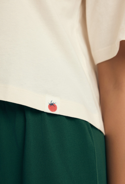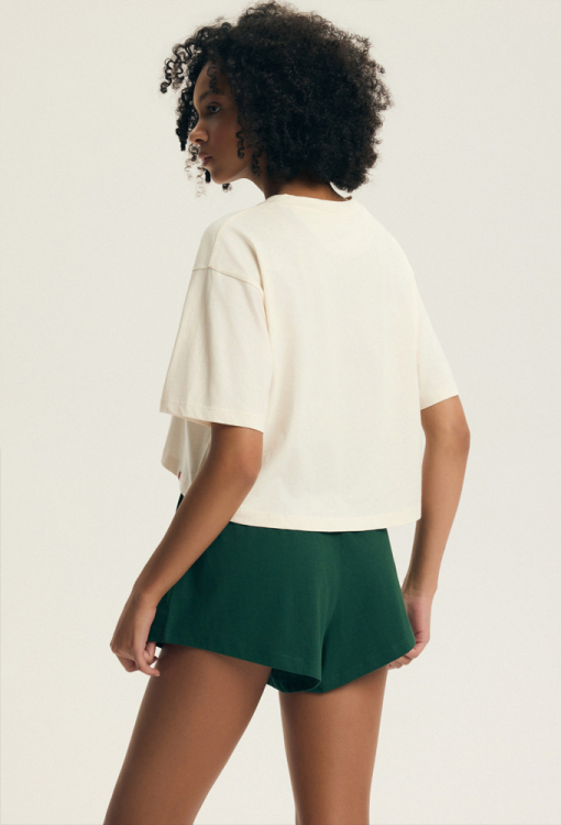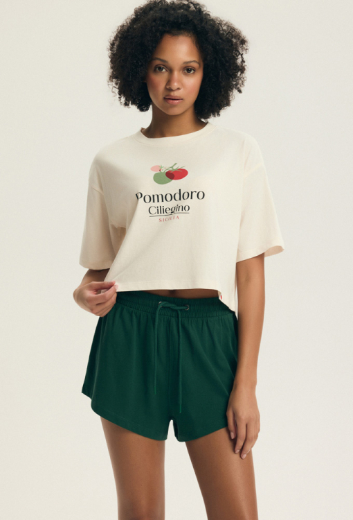 Стильная женская пижама Dessie от польского бренда Henderson Ladies. Пижама выполнена из мягкого и качественного хлопка, состоит из укороченной футболки свободного силуэта, кремового цвета и зеленых шорт свободного кроя. Футболка с короткими рукавами, заниженным плечевым швом и круглым вырезом горла, на уровне груди украшена принтом из помидор и надписью "pomodoro ciliegino sicilia". Шорты с удобной посадкой и мягкой резинкой в поясе, регулируются по ширине с помощью внутреннего шнурка. Пижама очень красивая и комфортная, также будет отличным вариантом одежды для дома или полезным подарком любимому и близкому человеку.