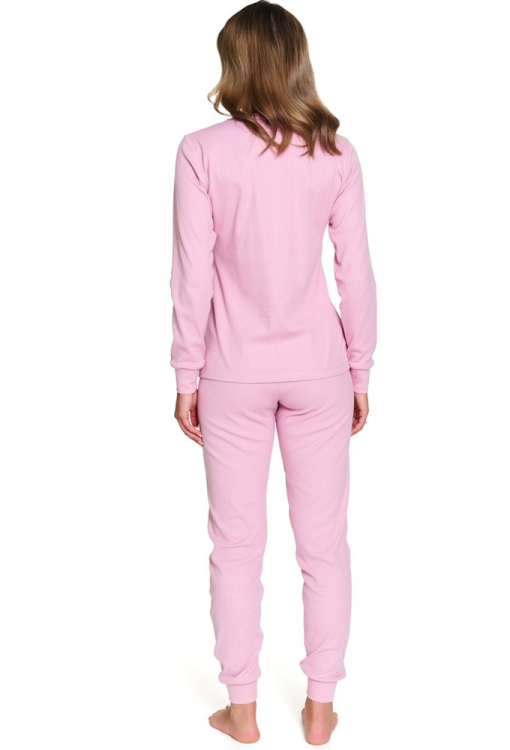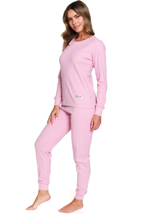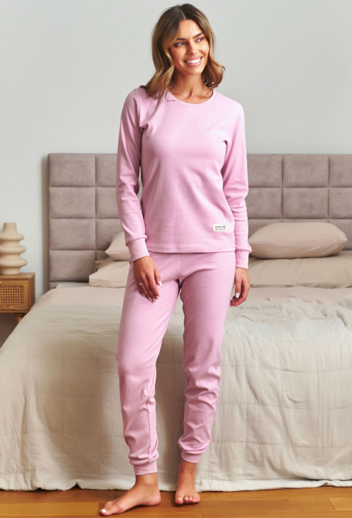 Классическая женская пижама от польского бренда Doctor Nap. Пижама выполнена из высококачественного и мягкого хлопка в рубчик розового цвета, состоит из кофты полуприлегающего силуэта и штанов на манжетах. Кофта с длинными рукавами и круглым вырезом горла, рукава обработаны манжетами, штаны с мягкой резинкой в поясе. Пижама красивая и очень комфортная, идеальна для домашних вечеров и ночей, также может быть замечательным подарком любимому и близкому человеку.