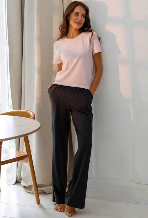 Элегантная женская пижама из коллекции Don't Worry от украинского бренда Roksana. Пижама выполнена из мягкого и качественного хлопка, состоит из футболки розового цвета и графитовых штанов с принтом в виде контурных сердечек и надписей "Love" в розовых тонах. Футболка прямого силуэта, с короткими рукавами и круглым вырезом горла. Штаны свободного кроя, с мягкой резинкой в поясе и удобными боковыми карманами. Пижама очень красивая и приятная к телу, идеальна не только для сна, а и для утренних сборов и вечернего релакса дома, также может быть замечательным подарком любимому и близкому человеку.