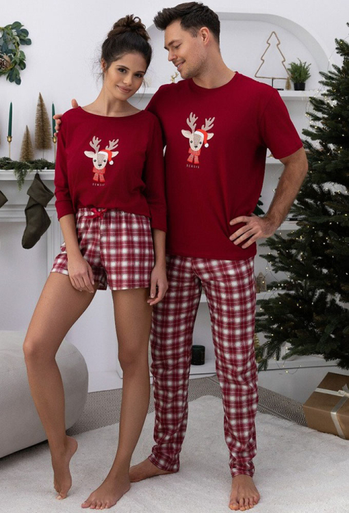 Яркая женская новогодняя пижама Elia от польского бренда Sensis. Пижама выполнена из качественного и мягкого хлопка, состоит из кофты бордового цвета и коротких шорт в бордовый и белій клетчатый принт. Кофта прямого силуэта, с рукавами 3/4 и круглым вырезом горла, спереди украшена принтом в виде олененка в рождественском стиле. Шорты с мягкой резинкой в поясе и бордовым атласным бантиком по центру. Пижама стильная и очень комфортная, также может быть удобной одеждой для дома или полезным подарком любимому и близкому человеку.
