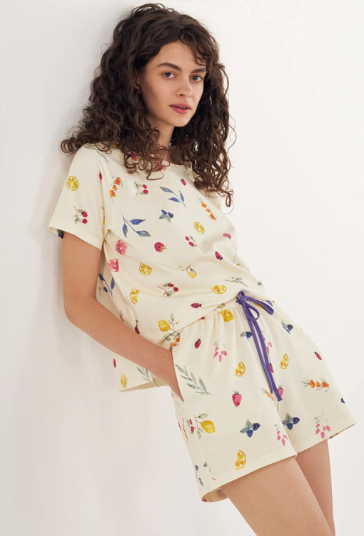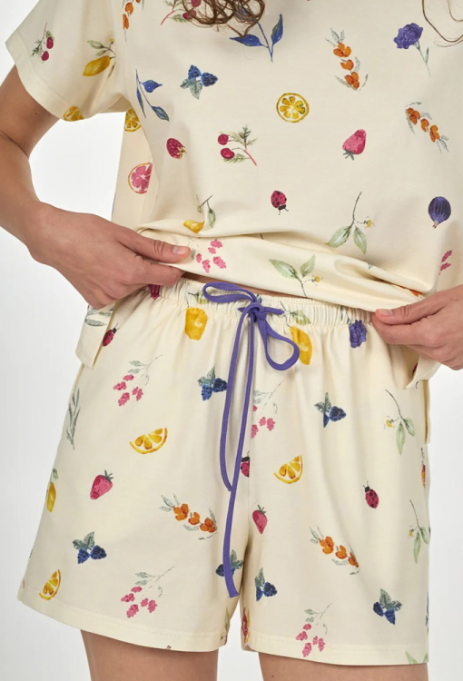 Красочная женская пижама из коллекции Fruity Delight от украинского бренда Ellen. Пижама выполнена из качественного и мягкого хлопка, кремового цвета с ярким принтом в виде фруктов, состоит из футболки и шорт свободного силуэта. Футболка с короткими рукавами и круглым вырезом горла, по бокам внизу обработана разрезами. Шорты с мягкой резинкой в поясе и удобными боковыми карманами, регулируются по ширине с помощью внутреннего шнурка синего цвета. Пижама очень красивая и комфортная, может быть отличной одеждой для дома или полезным подарком любимому и близкому человеку.